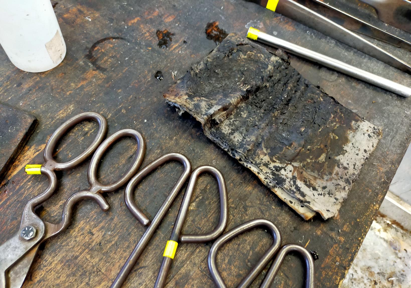 ガラス製作の工房には、製作のための道具が整然と並べてあり、それぞれに用途、名前があります。ガラスはベネチアが発祥なので、イタリア語で呼ぶ道具もありました。ちなみに柔らかいガラスの形を整える「紙リン」に使うのは朝日新聞だけ。質が良いのだそうですよ〜。