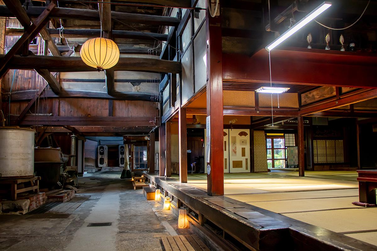 かつての北国街道の宿場町で重厚な存在感を発揮するのが、旧宮崎酒造の建物です。界隈の大規模な商家の特徴のひとつ「トオリニワ」があり、往時の暮らしぶりを垣間見ることができます。