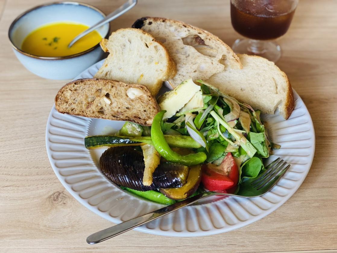 南砺市井波にある2023年にオープンしたベーカリーカフェ。自家製のパンを複数楽しめるプレートランチや、旬の野菜をふんだんに使用したピザなどのラインナップも豊富。