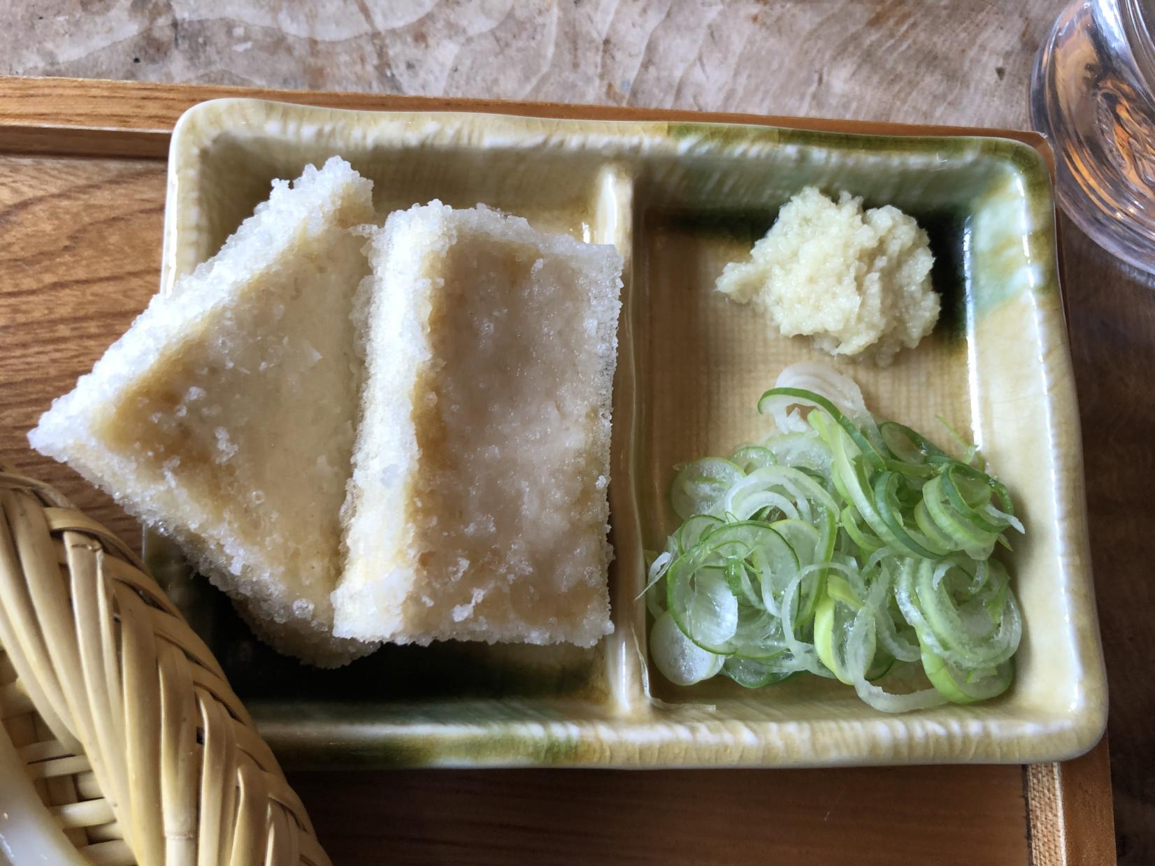 昔はわら縄で縛って運んだといわれている五箇山豆腐のおさしみです。