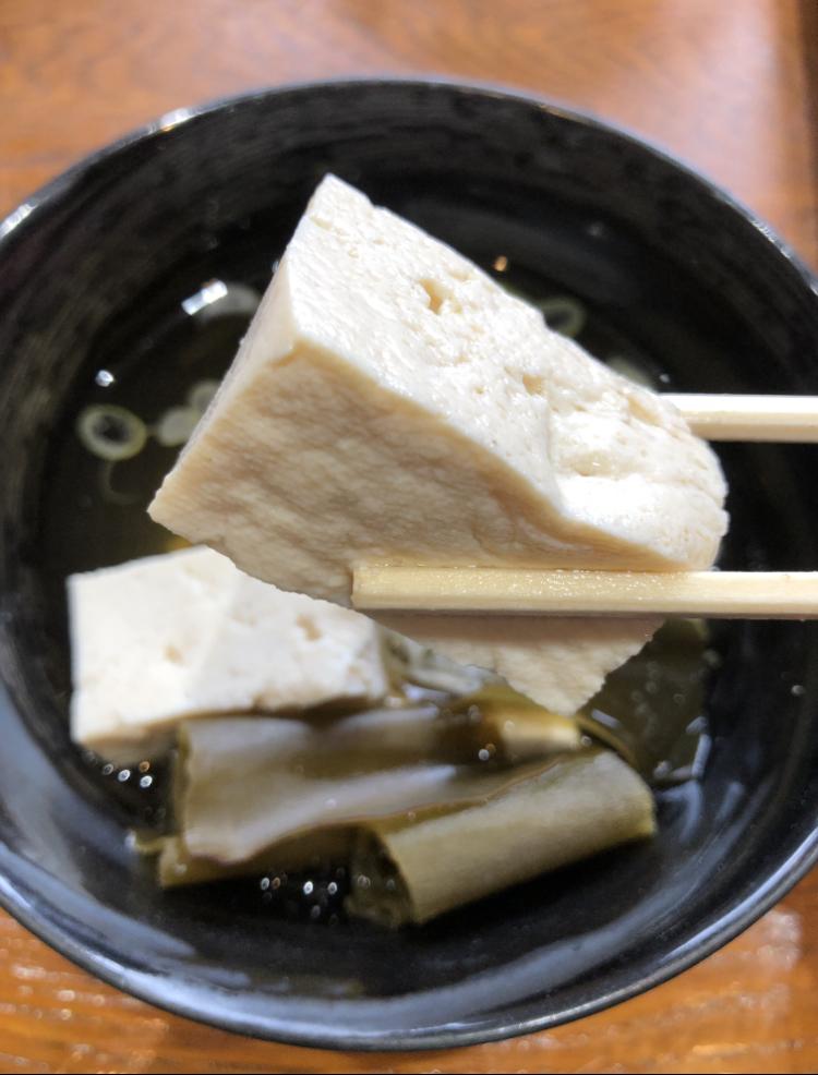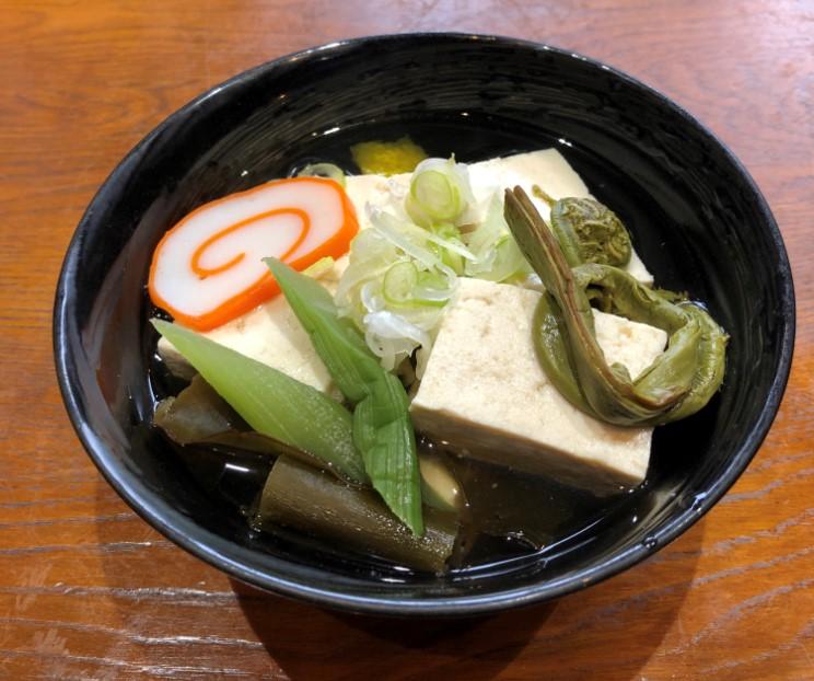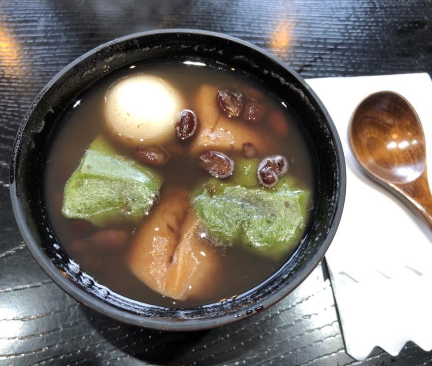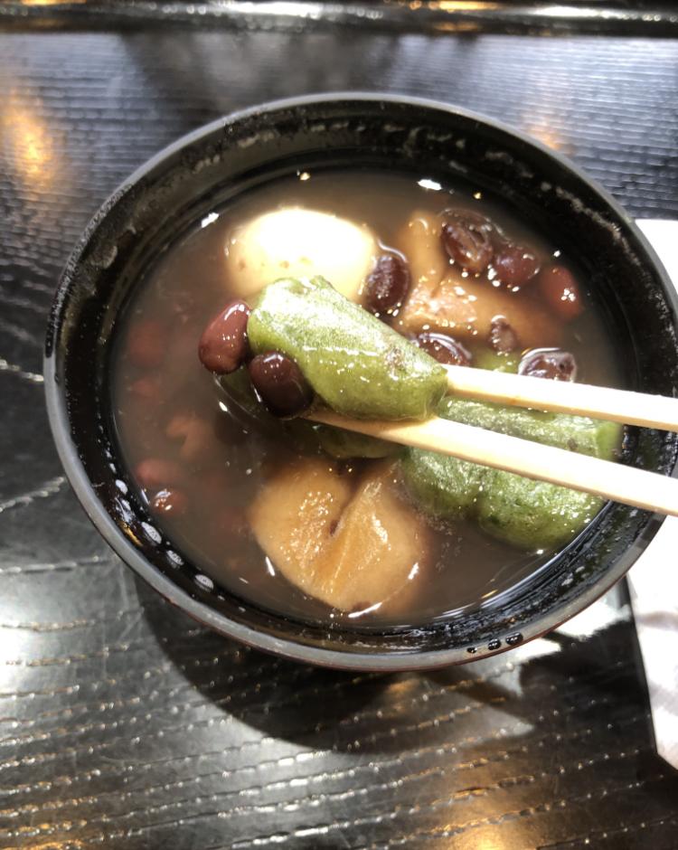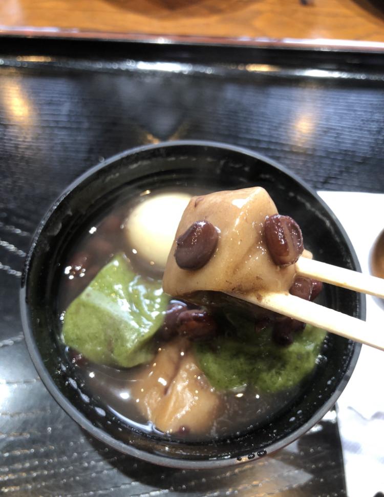 そして、お食事の後に「あいのくま」が毎回頂くのがこちらのぜんざい。この茶色いお餅は五箇山の銘菓、「栃餅(とちもち)」です。