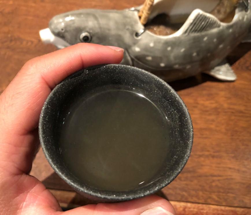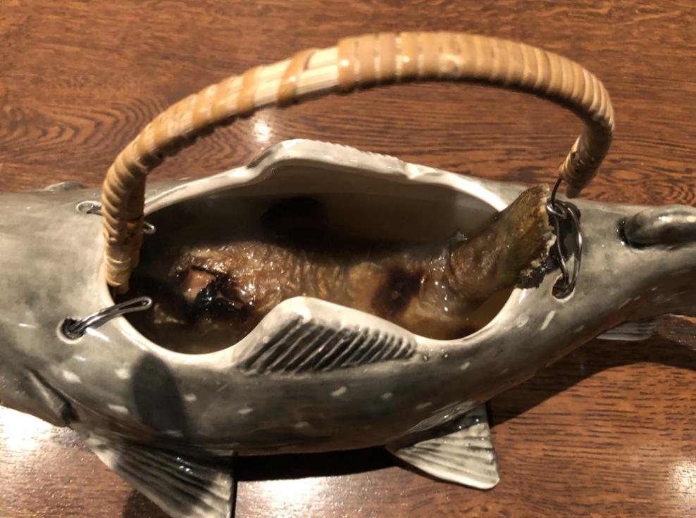 熱々のお酒の中に、じっくり焼かれた岩魚が一匹丸々入っているその名も「骨酒(こつざけ)」です!!