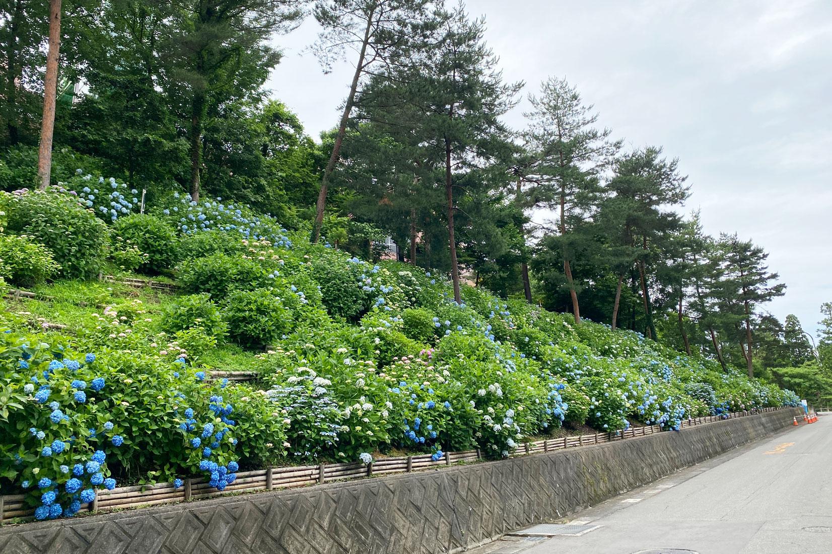 約500mにわたるあじさい通りを中心に、ヤマアジサイやガクアジサイなど、なんと約140種類、2万株ものあじさいが咲き誇ります。県内最大級というだけあって、その数はまさに圧巻。