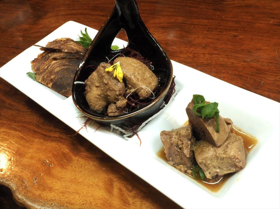 右下は濃厚な鰤の肝、中央は濃厚ながら食べやすいアマダイの肝、左上はもはや何年ものか想像もつかない貴重なイナダ。
