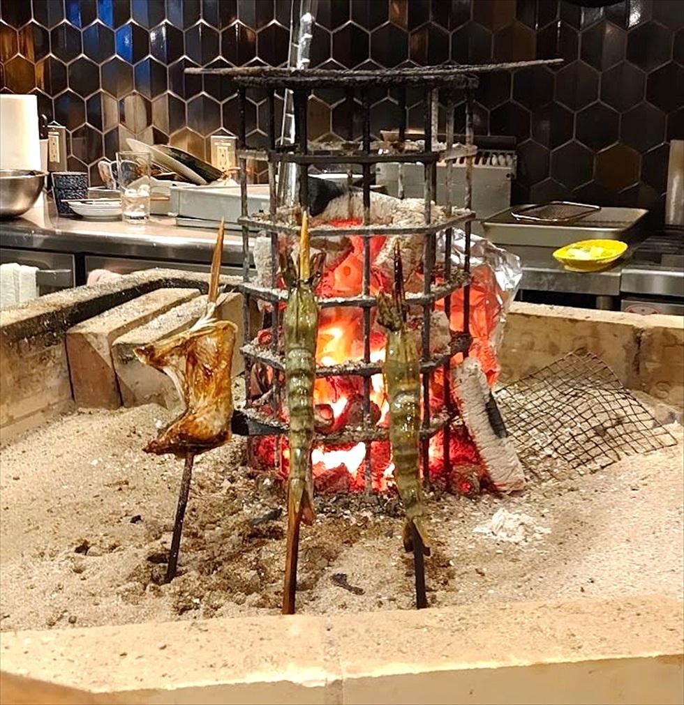 店内でひときわ目を引くのがこちらの囲炉裏。組み上げられた炭火でじっくり遠火で焼かれる魚はまさに絶品。