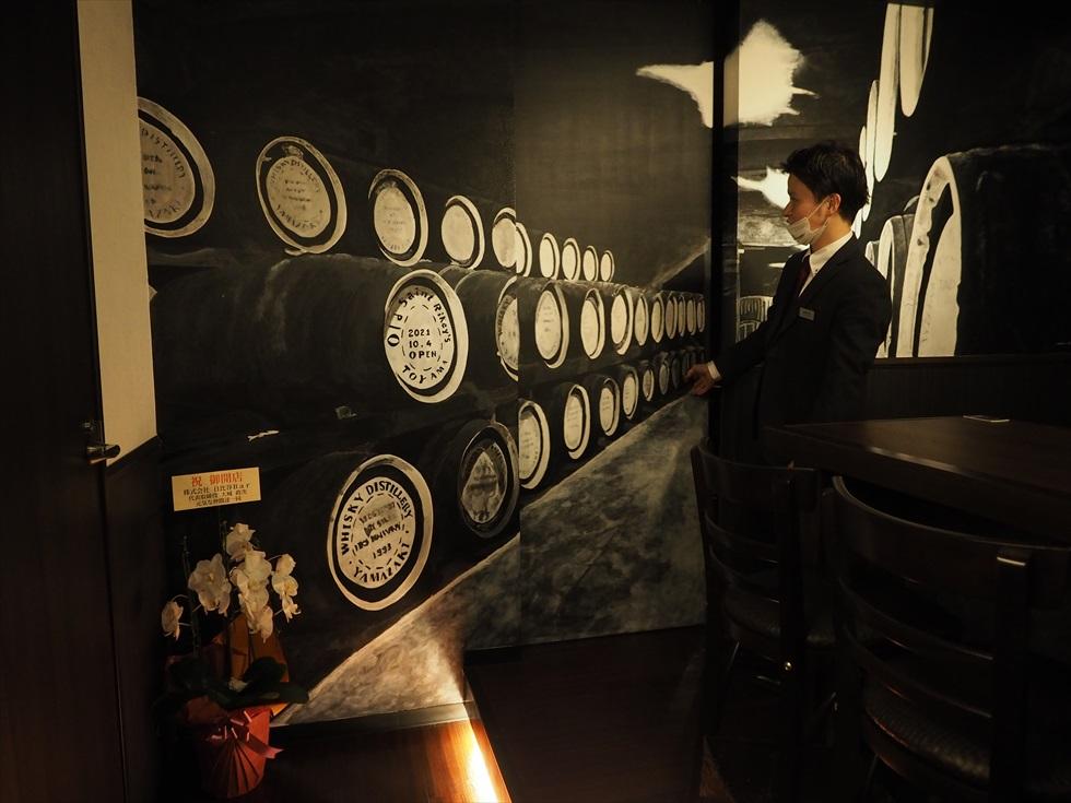 座席はカウンター席だけでなく、カップルや小団体向けのソファー席もあるのですが、必見なのはお店の奥にある壁···のさらに奥。