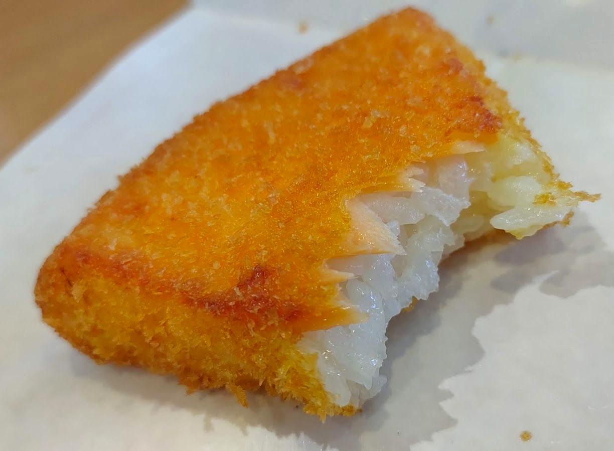 食べてみると、これがなんとも摩訶不思議な感覚に包まれるんですよ。衣は薄くてサクサク、ご飯はアツアツで鱒感もちゃんとあって、衣をまとった熱い酢飯というのがなんとも面白い。
