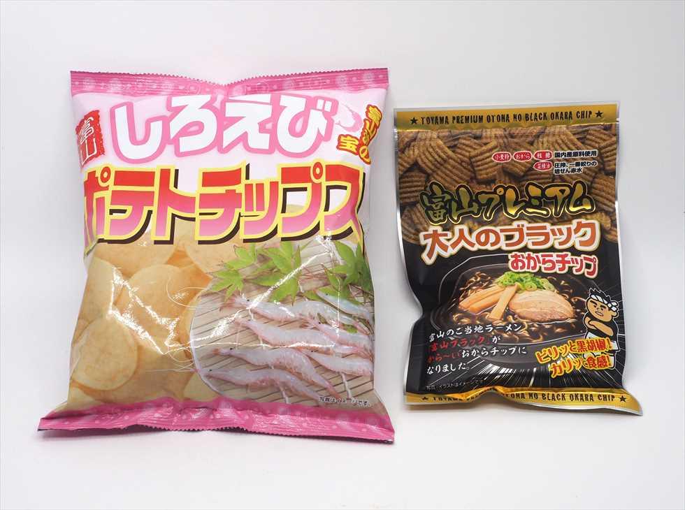 こちらで購入したお土産は、以前から気になっていた「富山しろえびポテトチップス」と、リピートとなる「富山プレミアム大人のブラック おからチップ」。