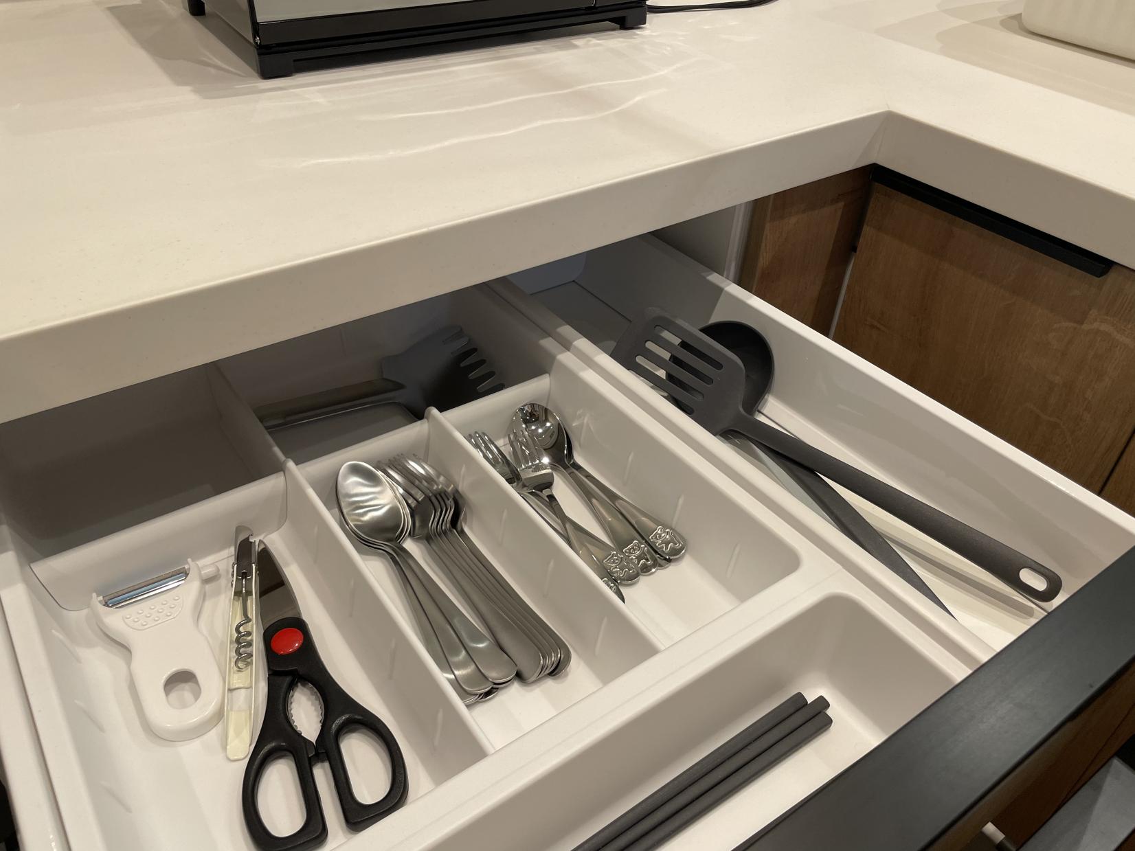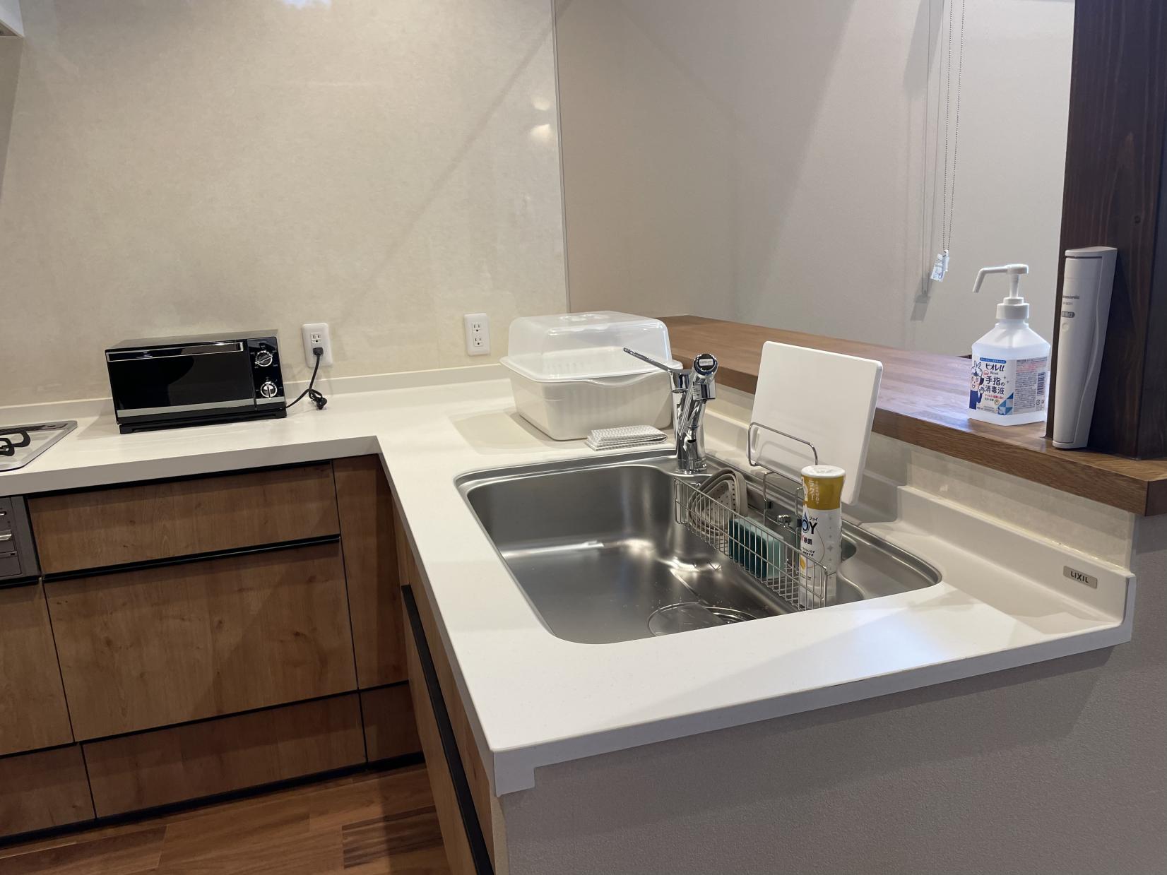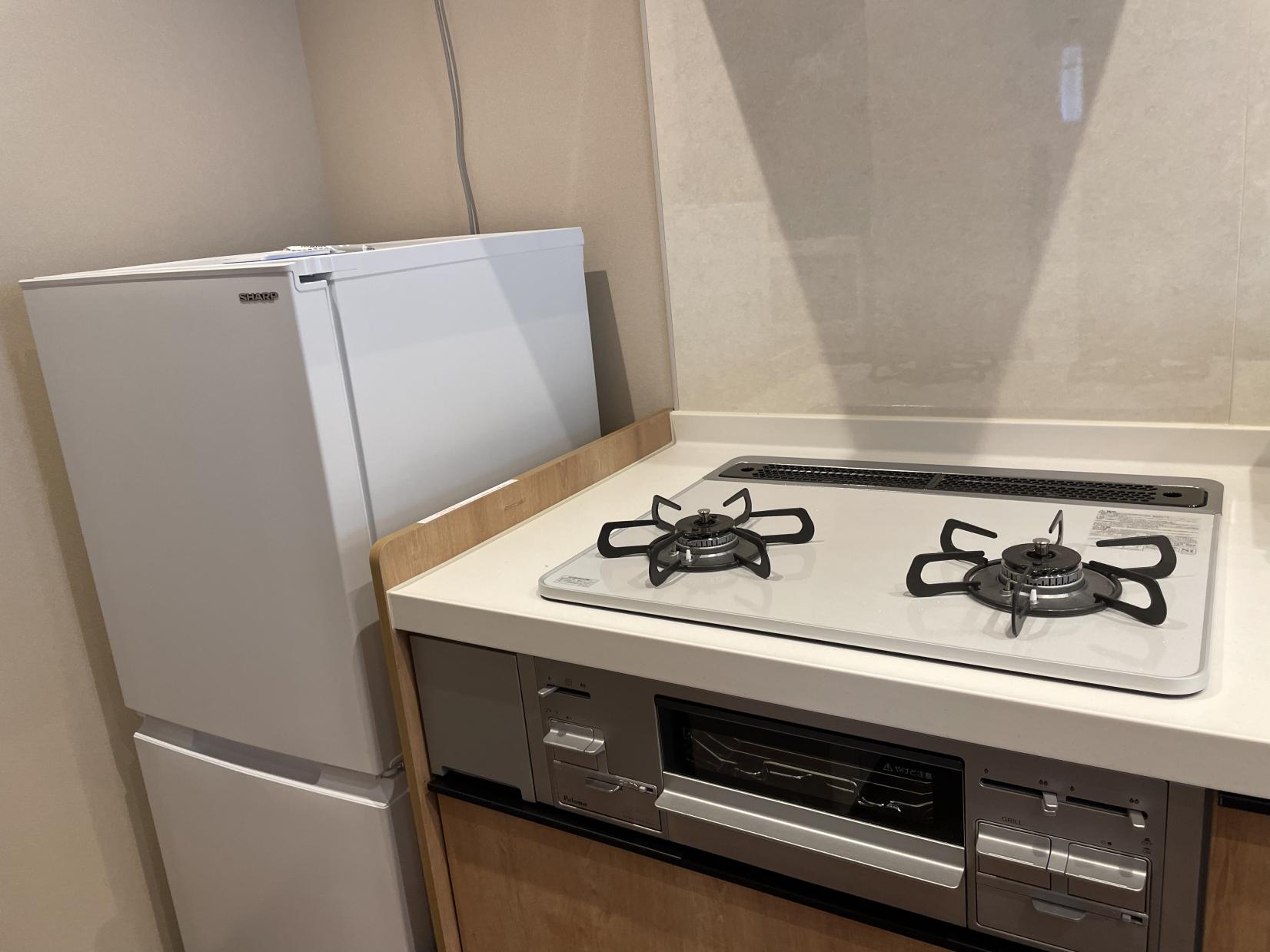 キッチンは、コンロが2口で調理スペースも充分にあり、キッチン用品やお皿もしっかり完備されています。