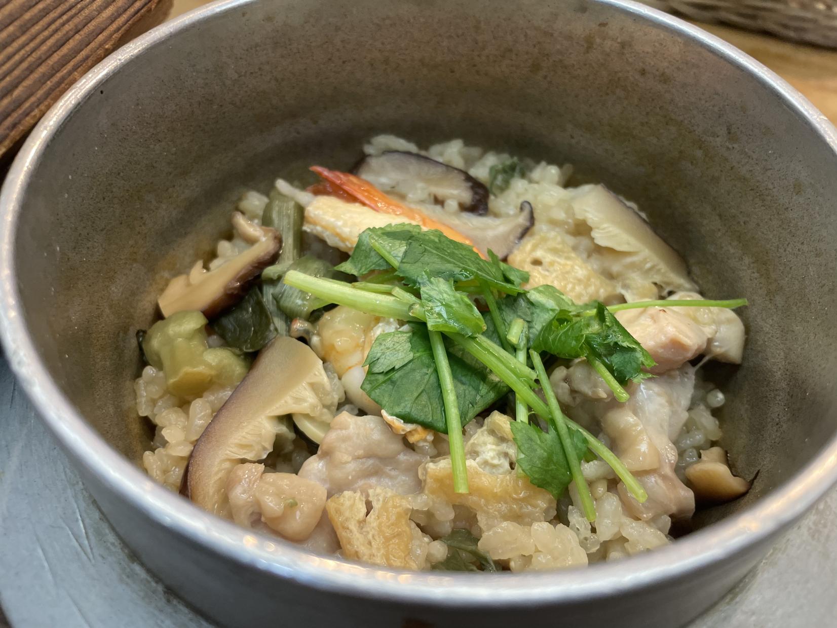 今回は、五目釜飯を注文。その他にも富山ならではの紅ズワイガニや、ホタルイカの釜飯メニューもありますよ。