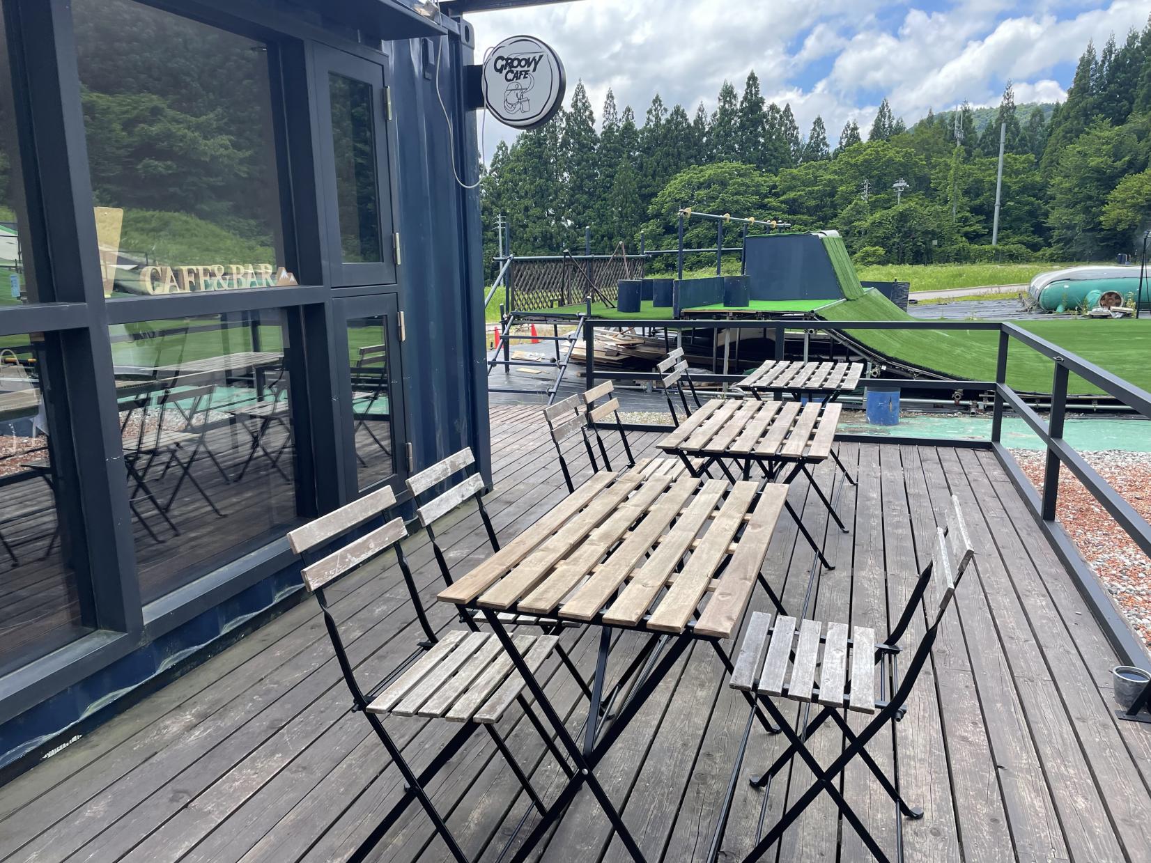 立山駅から車で約8分のところに位置するGROVY CAFE(グルーヴィーカフェ)は、「SLABO Outdoor Park TATEYAMA」というスノーボード・スキー用のキッカーやオートキャンプサイト、BBQ場、テントサウナなどのアウトドアが楽しめる複合施設の中にあります。
