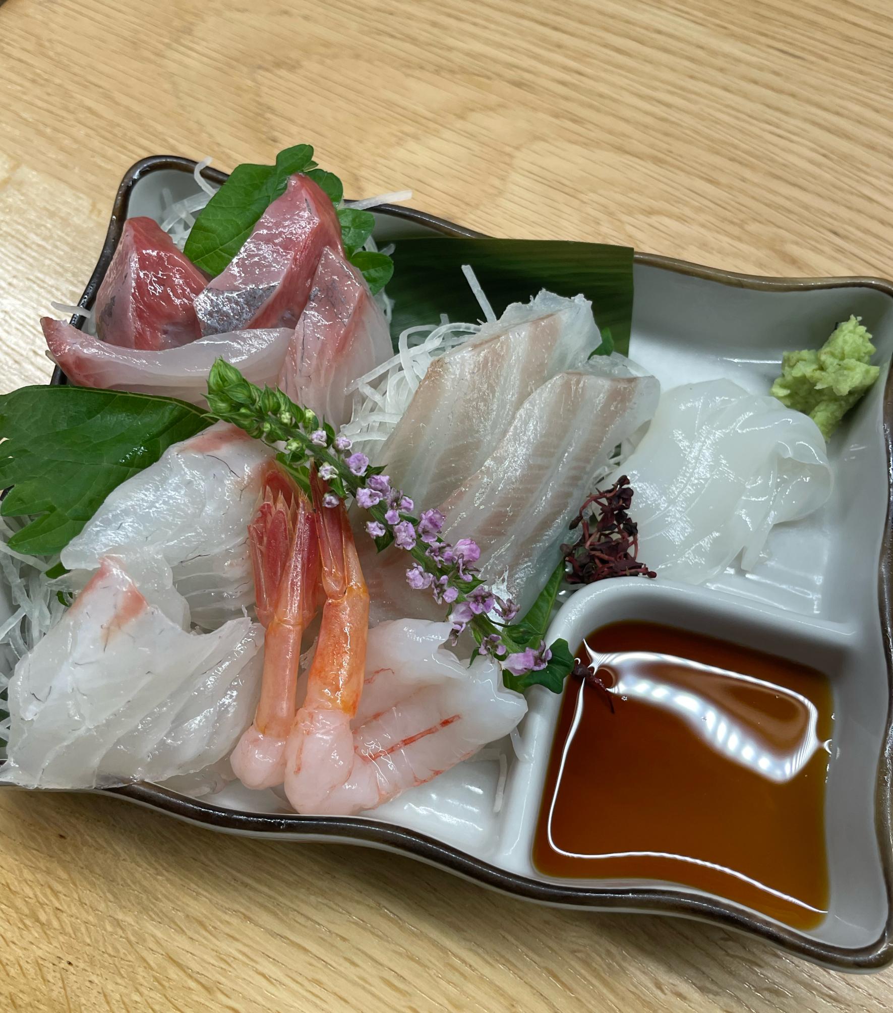 ・お造り5種盛り合わせ「カンパチ」「フクラギ」「甘エビ」「アオリイカ」「真鯛」「スズキ」