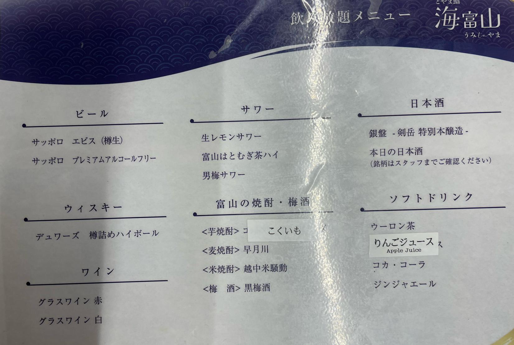 日本酒やビール、ソフトドリンクなど好きな飲み物を一人1杯選べます。