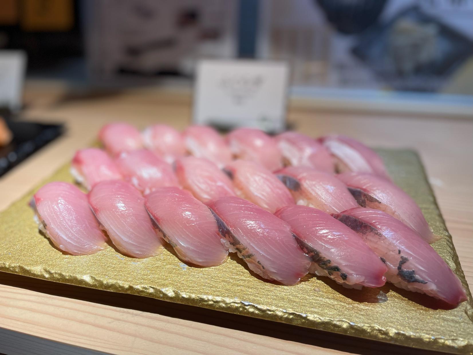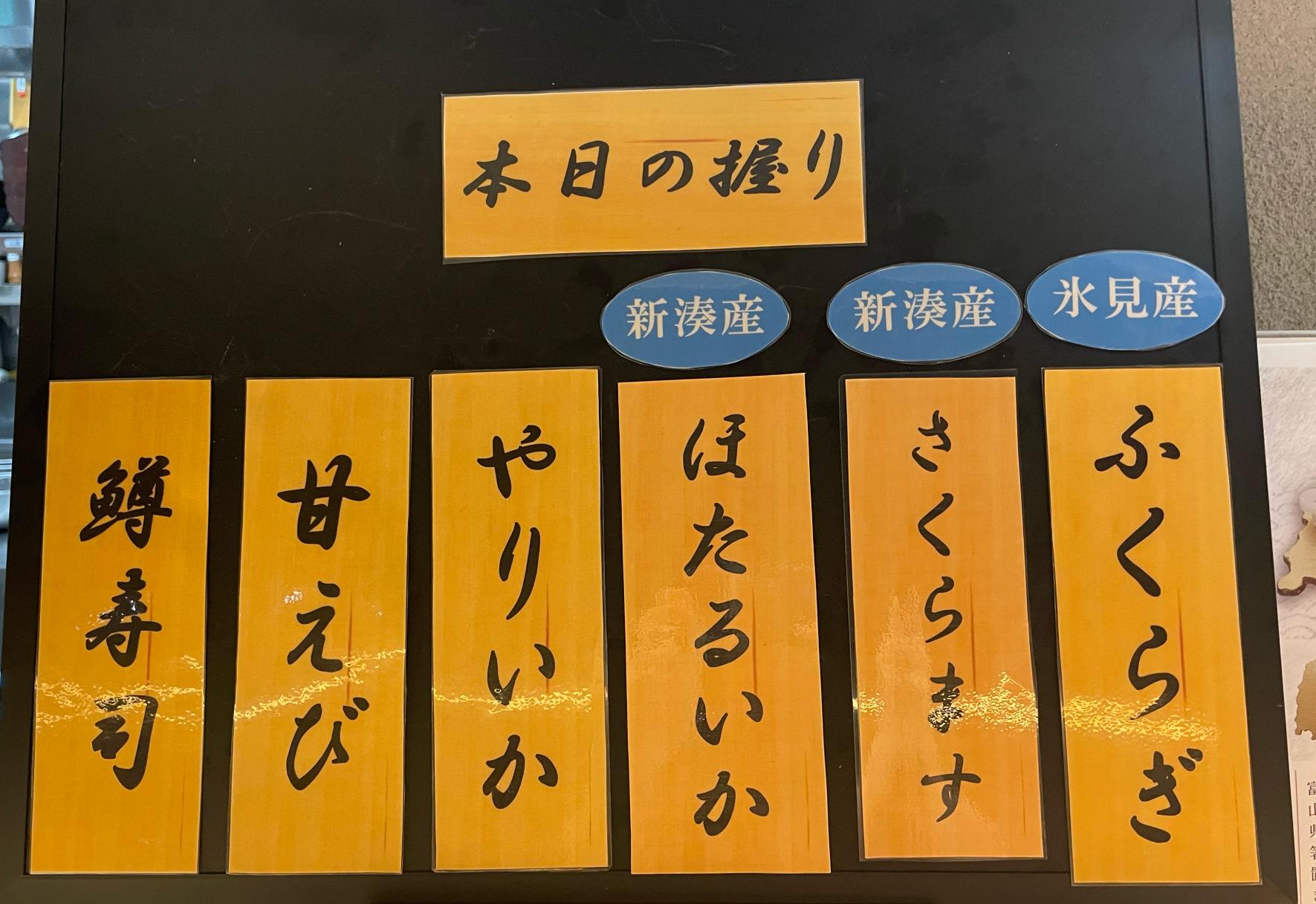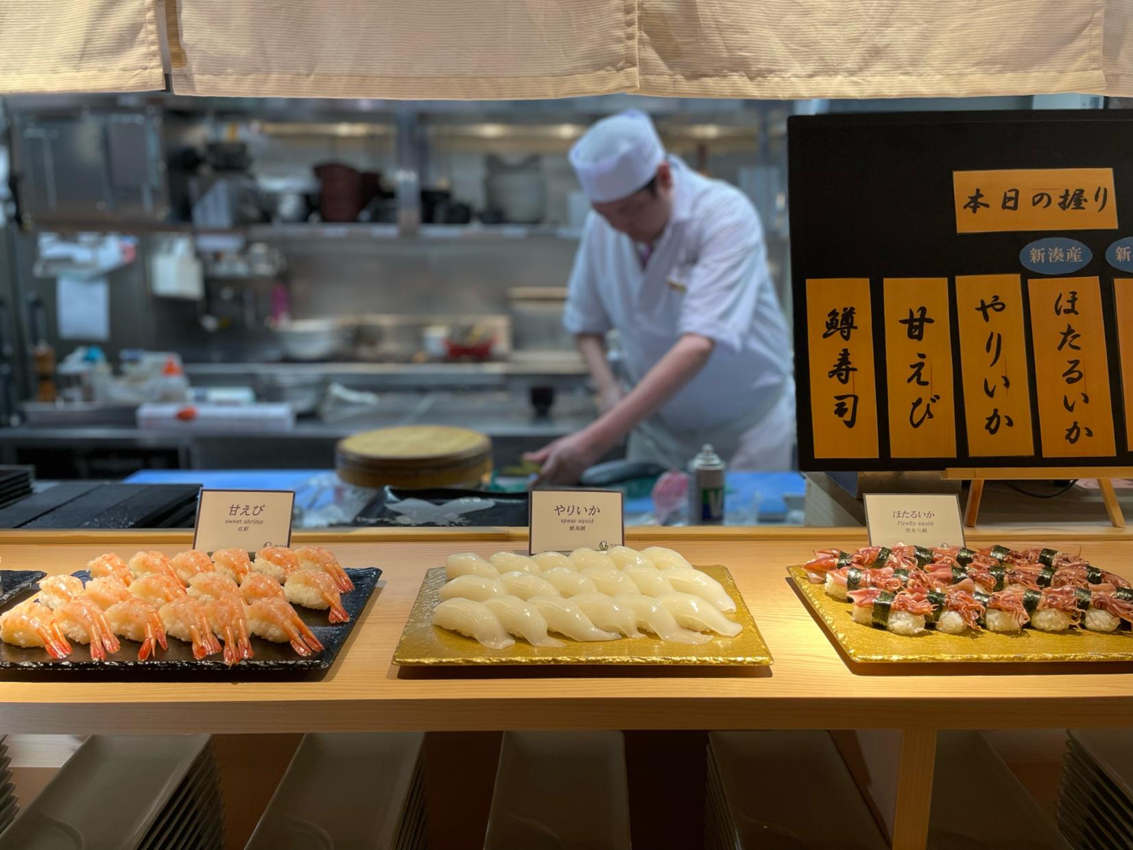 朝イチから氷見産の「フクラギ」や新湊産の「サクラマス」、「ホタルイカ」など、地元の旬のネタを中心にずらりと並んでました。