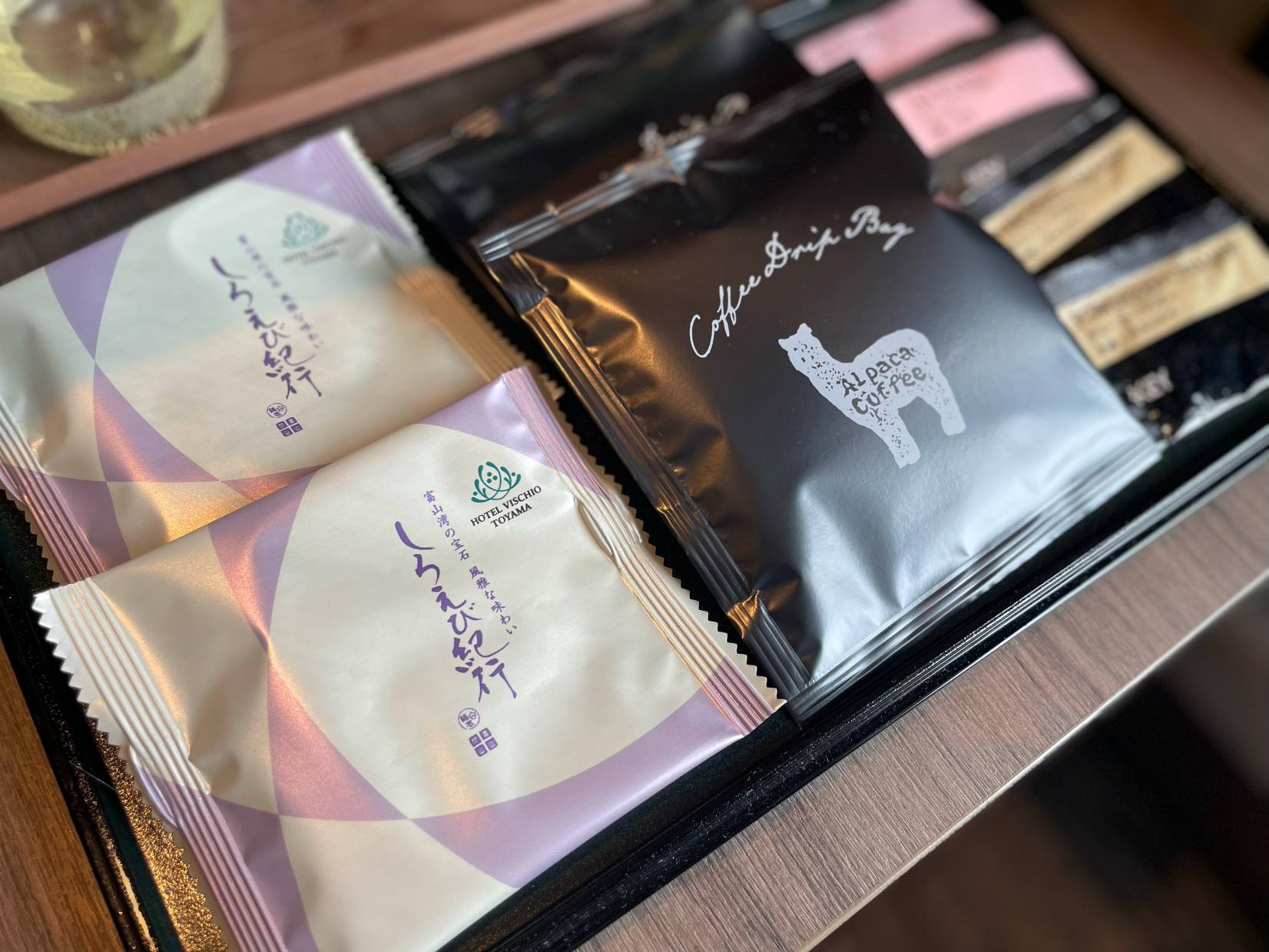 富山発のコーヒー屋さん、アルパカコーヒーや煎餅・白えび紀行など、名産品も用意されており、至れり尽くせりのサービスです。