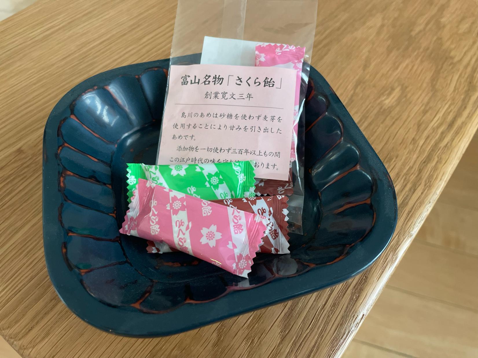 チェックアウトの際には江戸時代から愛されている富山の甘味、島川の飴もプレゼントいただきました。
