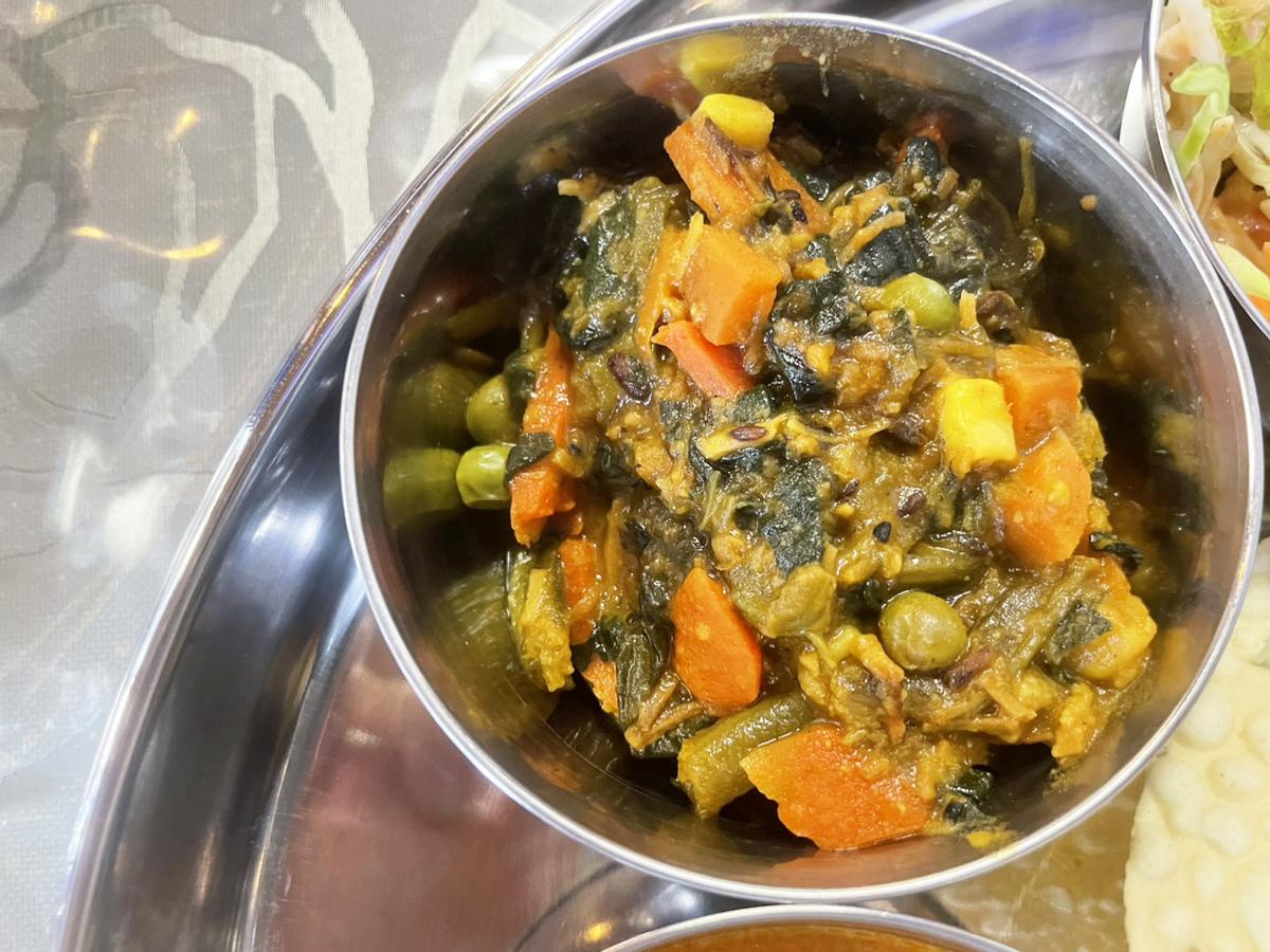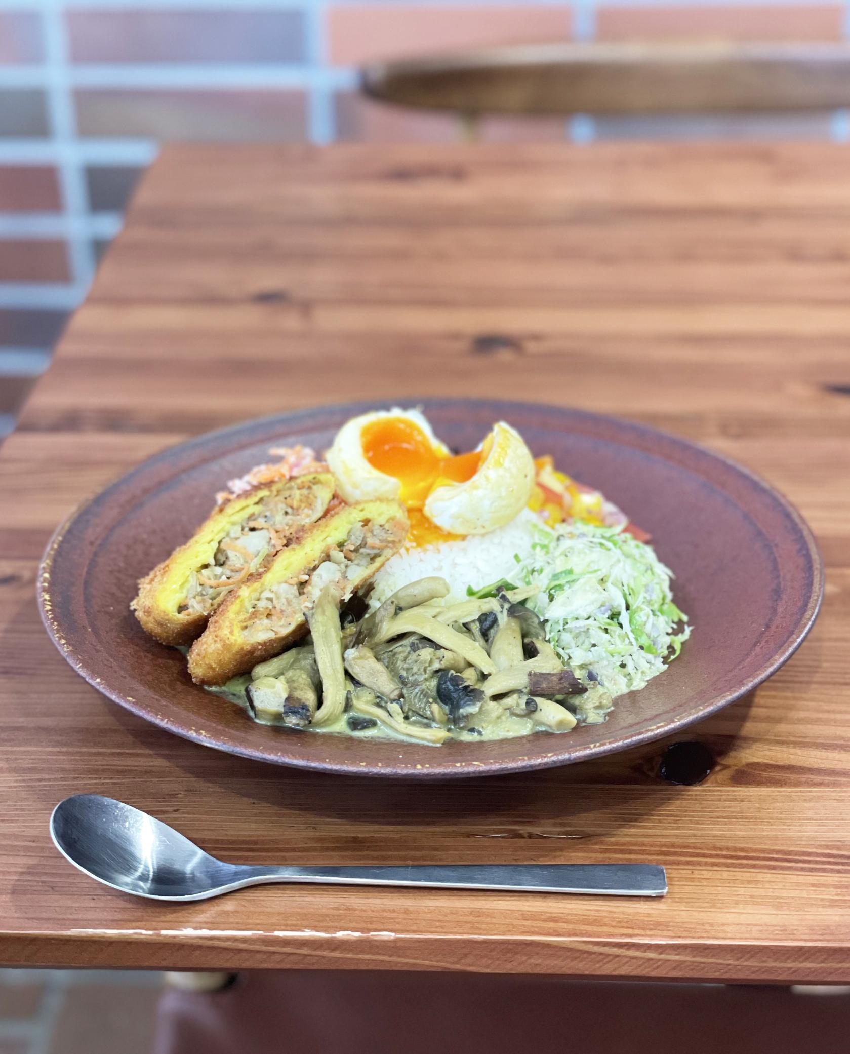 そこでスリランカビギナーには野菜たっぷりの「マイルドプレート」がおすすめ。辛さ控えめのさつまいもカレーを中心に、たっぷりの野菜がいただける一皿になります。(撮影時はキノコカレーでした)