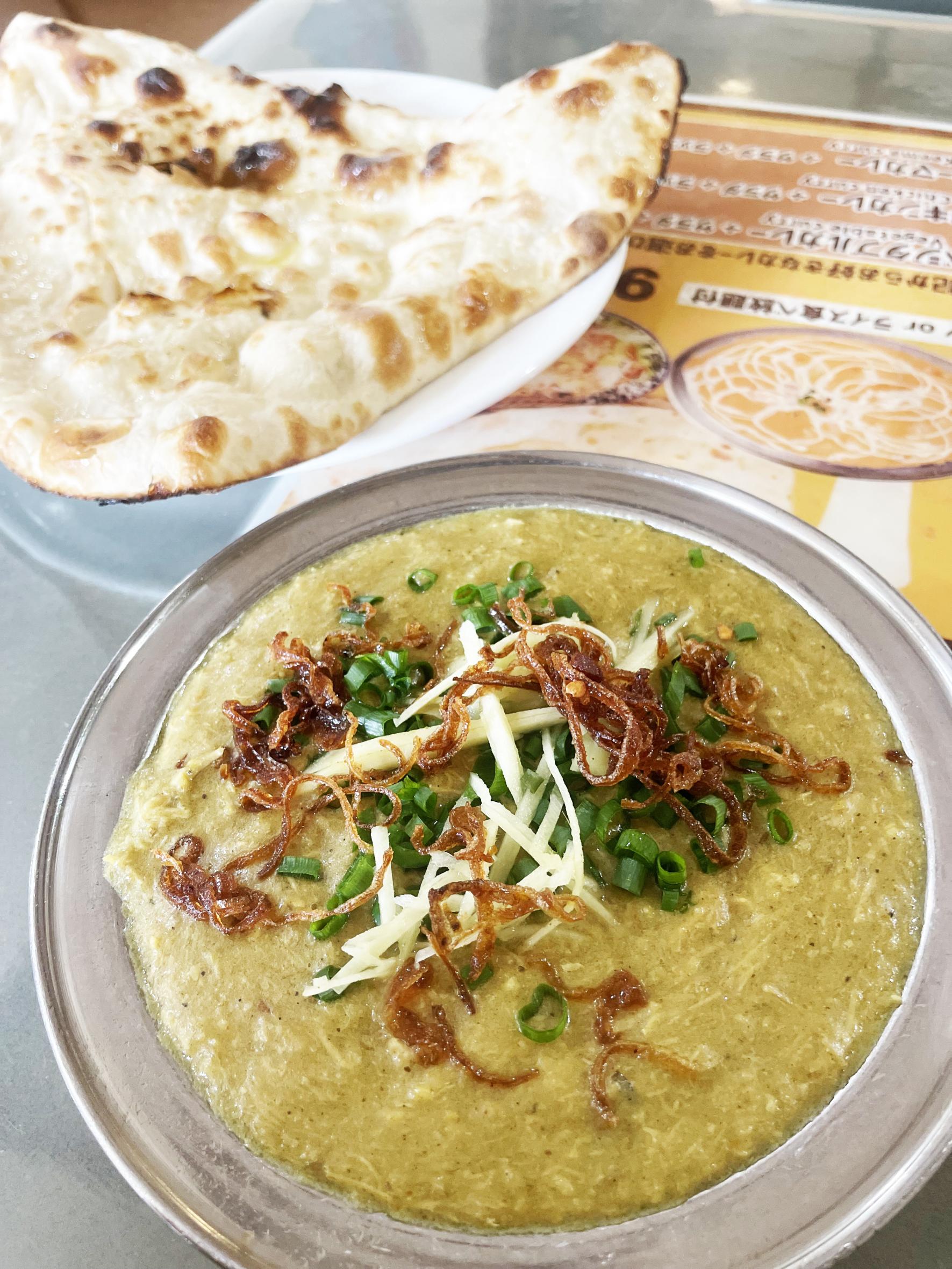具材の原型がなくなるまで、我慢強く約10時間煮込むことから、ペルシャ語で「忍耐」というそう。繊維状になるまで煮込まれた肉と、ピューレ状になった豆が混ぜ合わさったカレーはねっとりとしたコクと食感です。