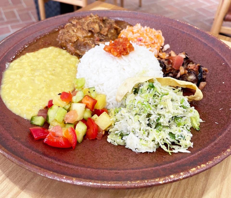 さまざまな種類のカレーを一皿に入れてご飯と混ぜるのがスリランカ流。食べ進めるうちに奥深い味になるので、混ぜ合わせながら楽しんでくださいね。