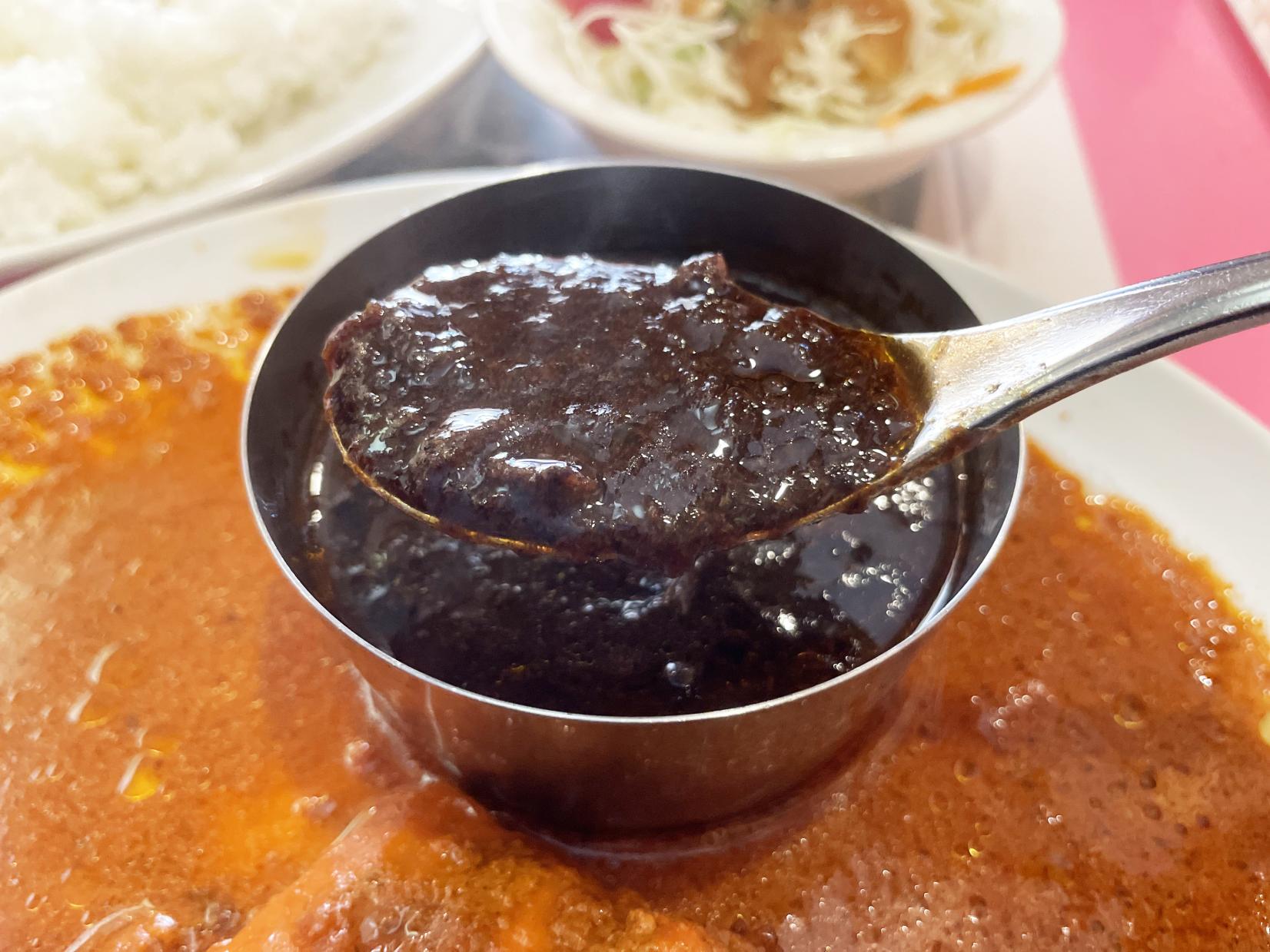 一人前に一個から一個半のタマネギを焦がさずに炒めてあり、この黒いカレーの色はその炒めタマネギの色そのままなんだそう。