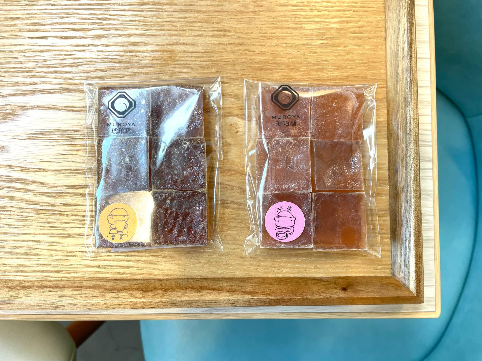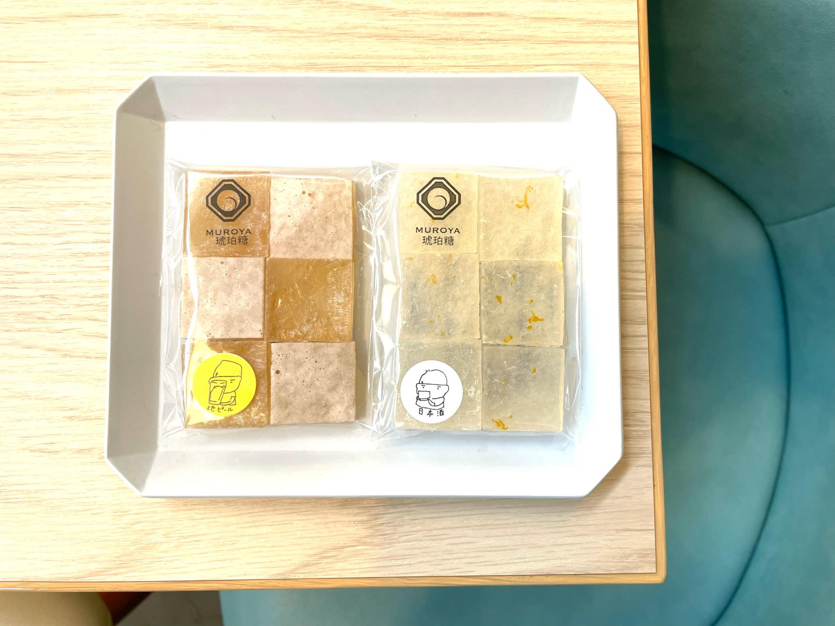 地の味を盛り込んだ「琥珀糖」(200円)は地ビール、日本酒、番茶、紅茶の4種類。歯触り、甘み、香りとともに200円でこのクオリティは驚きです。