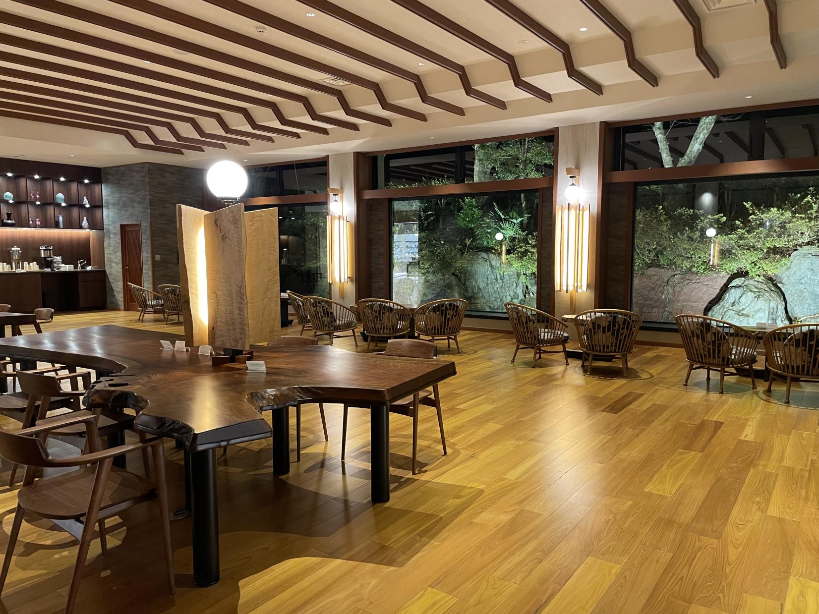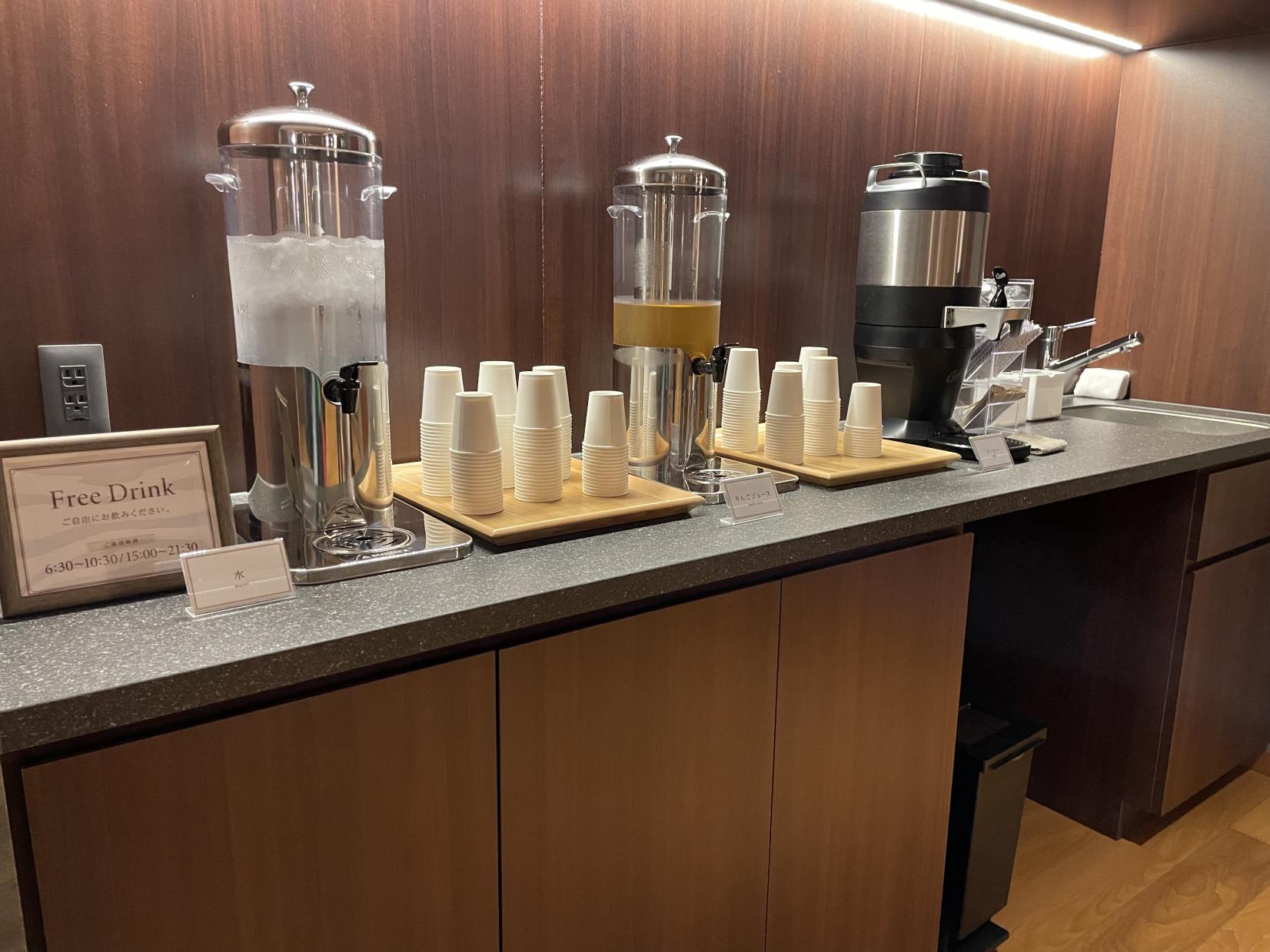 天然木を感じるくつろぎの空間でコーヒー、お茶、リンゴジュースのフリードリンクのサービスを受けました。まったり。