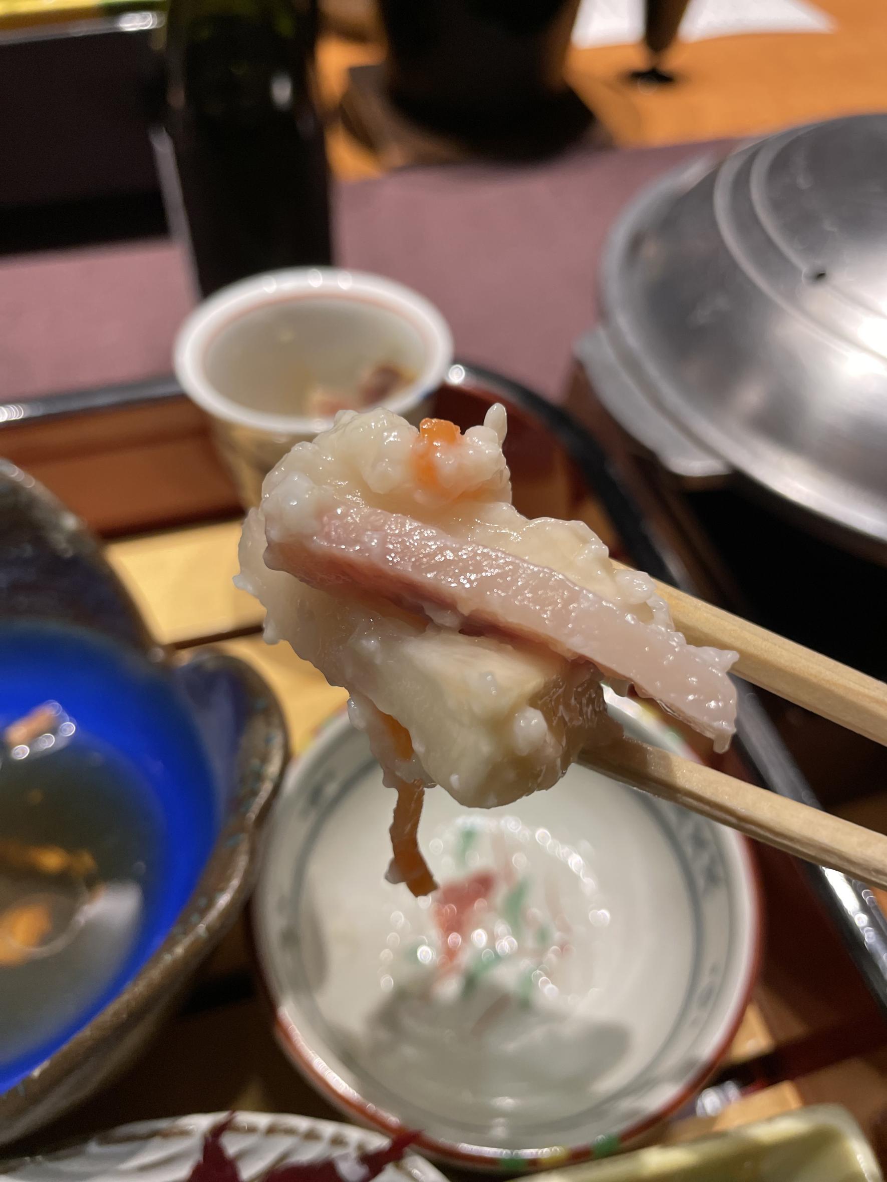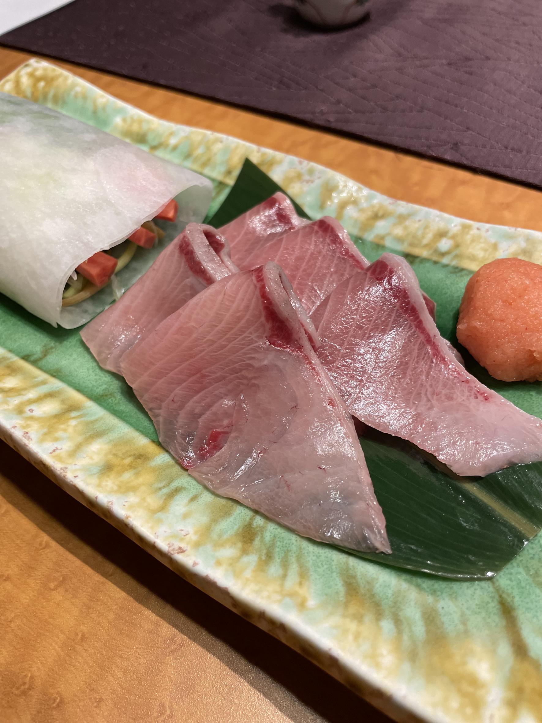 富山ではサスと呼ばれている新鮮な黒皮カジキマグロを上質な昆布と生姜でしめたお刺身です。サスの身に昆布の旨味がたっぷりと染み込んでいました。