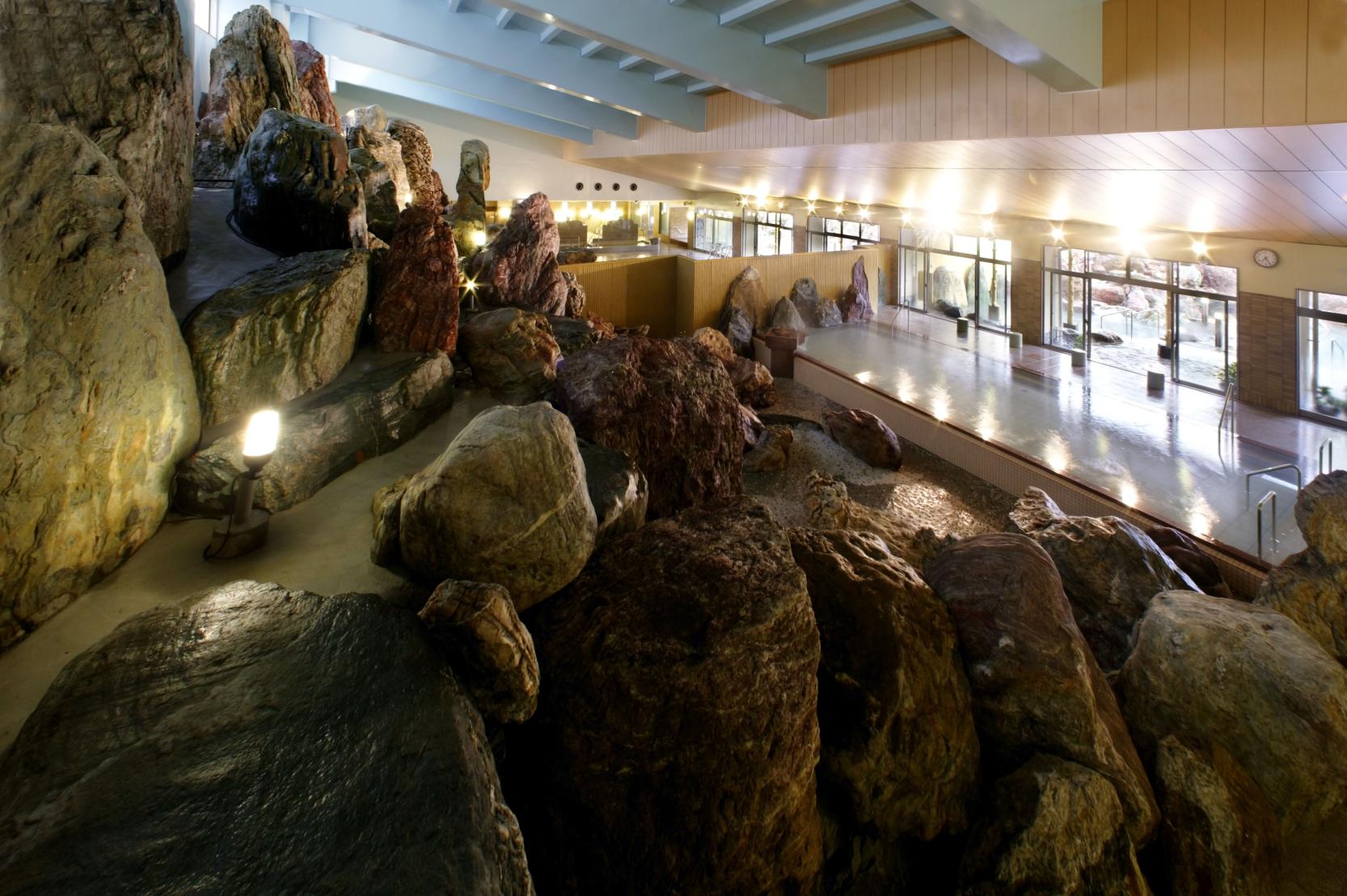 全国から集めた銘石、奇岩を使い、浴場内に雄大な立山連峰を再現しています。