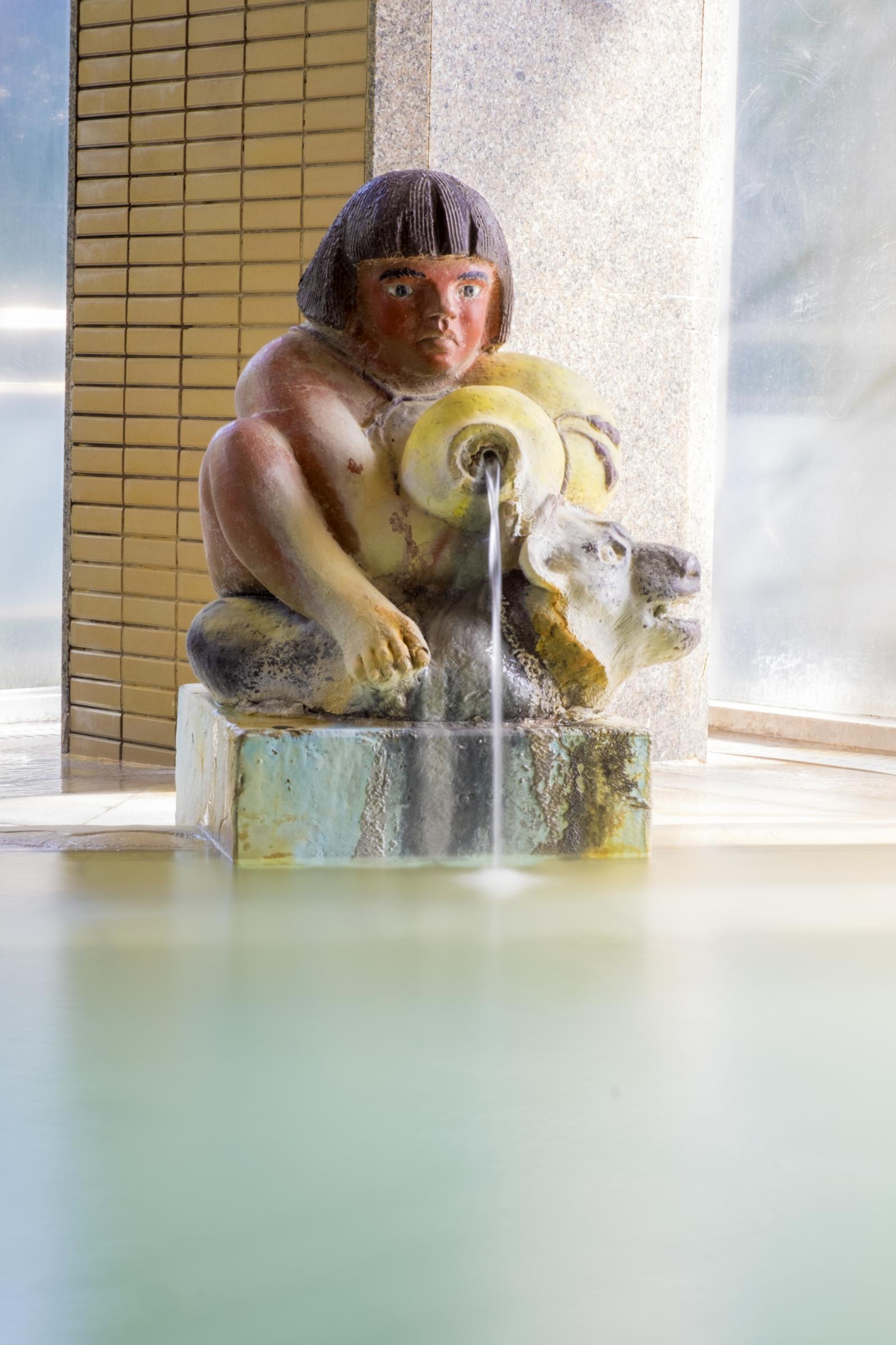 文化勲章受章者、浅蔵五十吉氏の陶板作品を浴室一面に配しています。