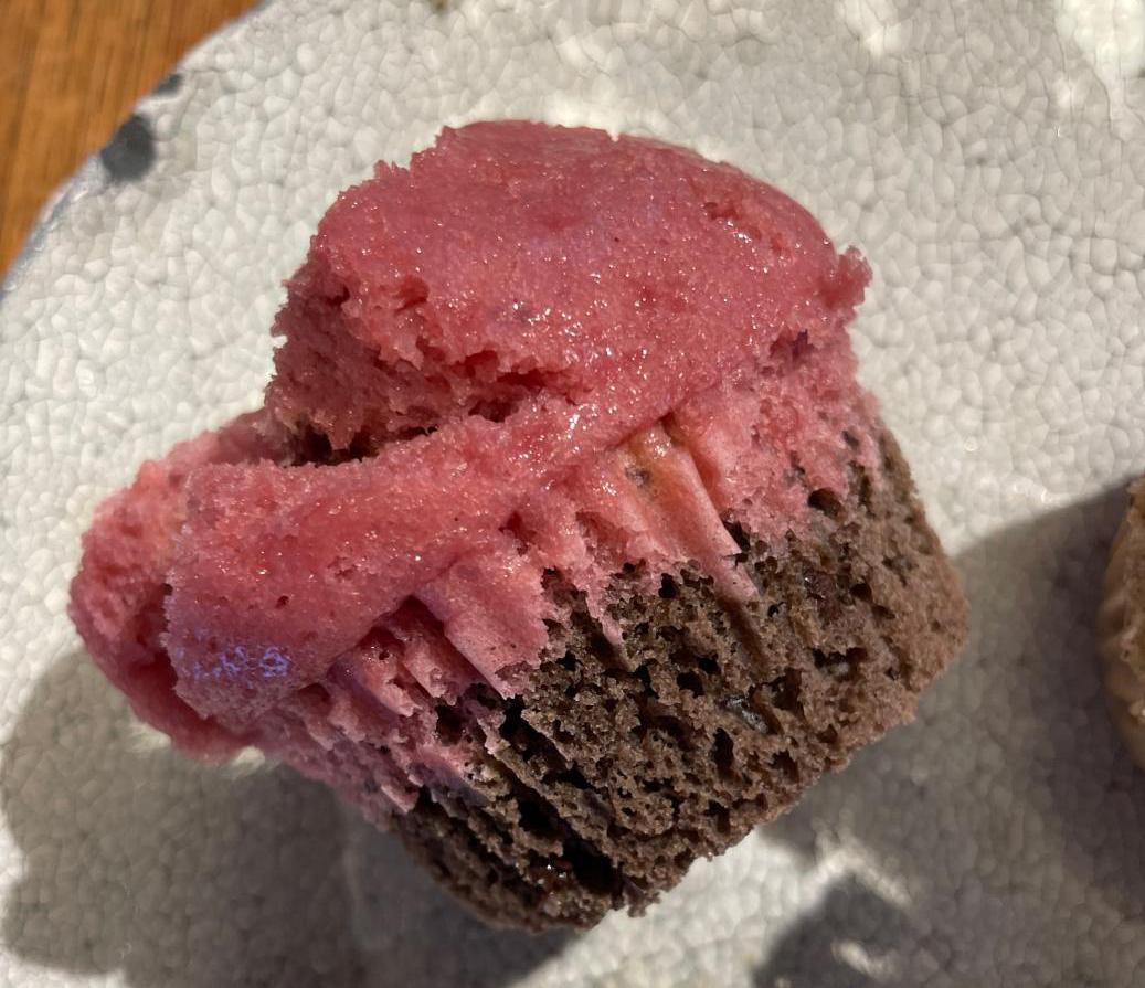 チョコとイチゴの蒸しパンはピンクとチョコのセパレートカラーが遊び心満載。見た目も可愛いです。