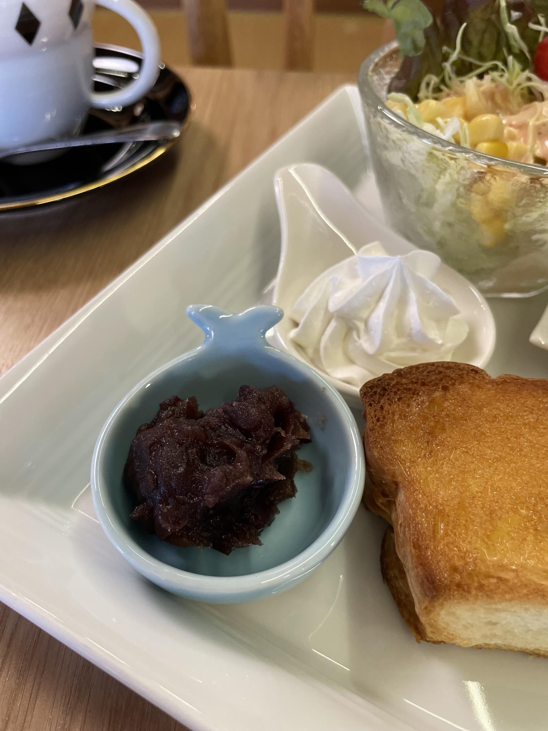 カリッと厚切りのトーストには小倉と生クリームを選んでトッピングしました。