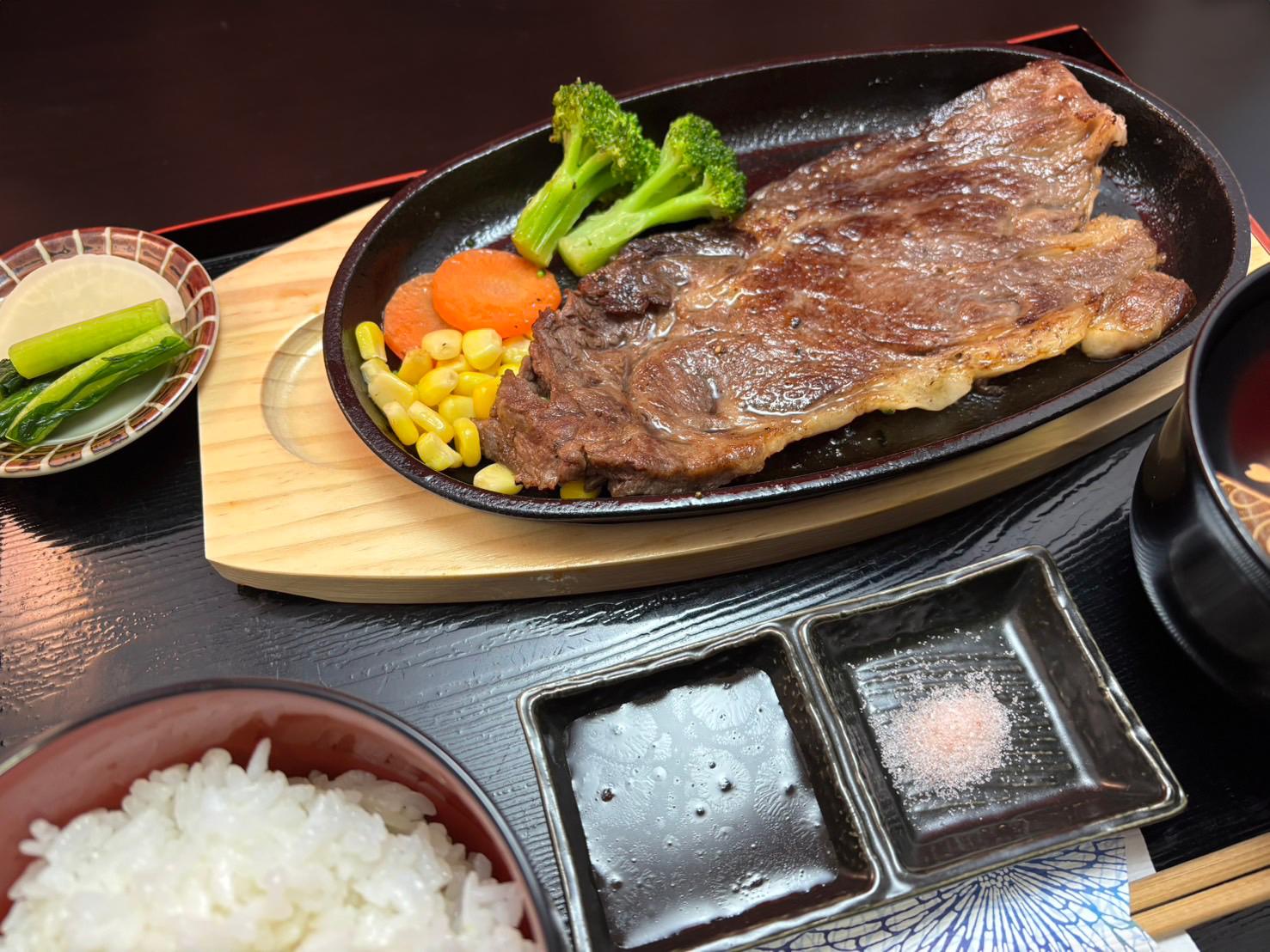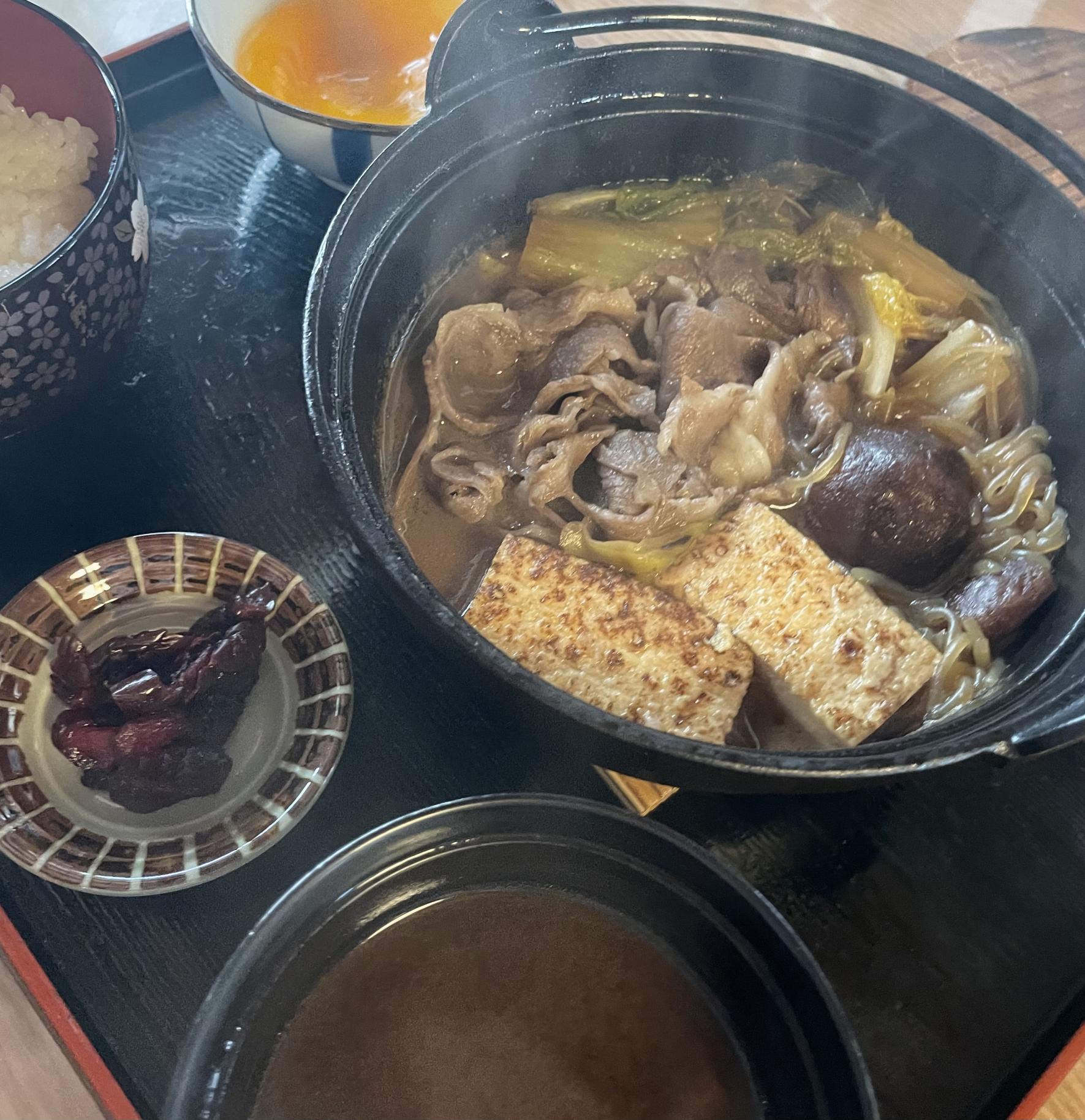 シンプルながらジューシーなステーキと甘めの出汁にたっぷりの野菜と柔らかいすき焼き。どちらも甲乙つけがたい特別ランチでした。