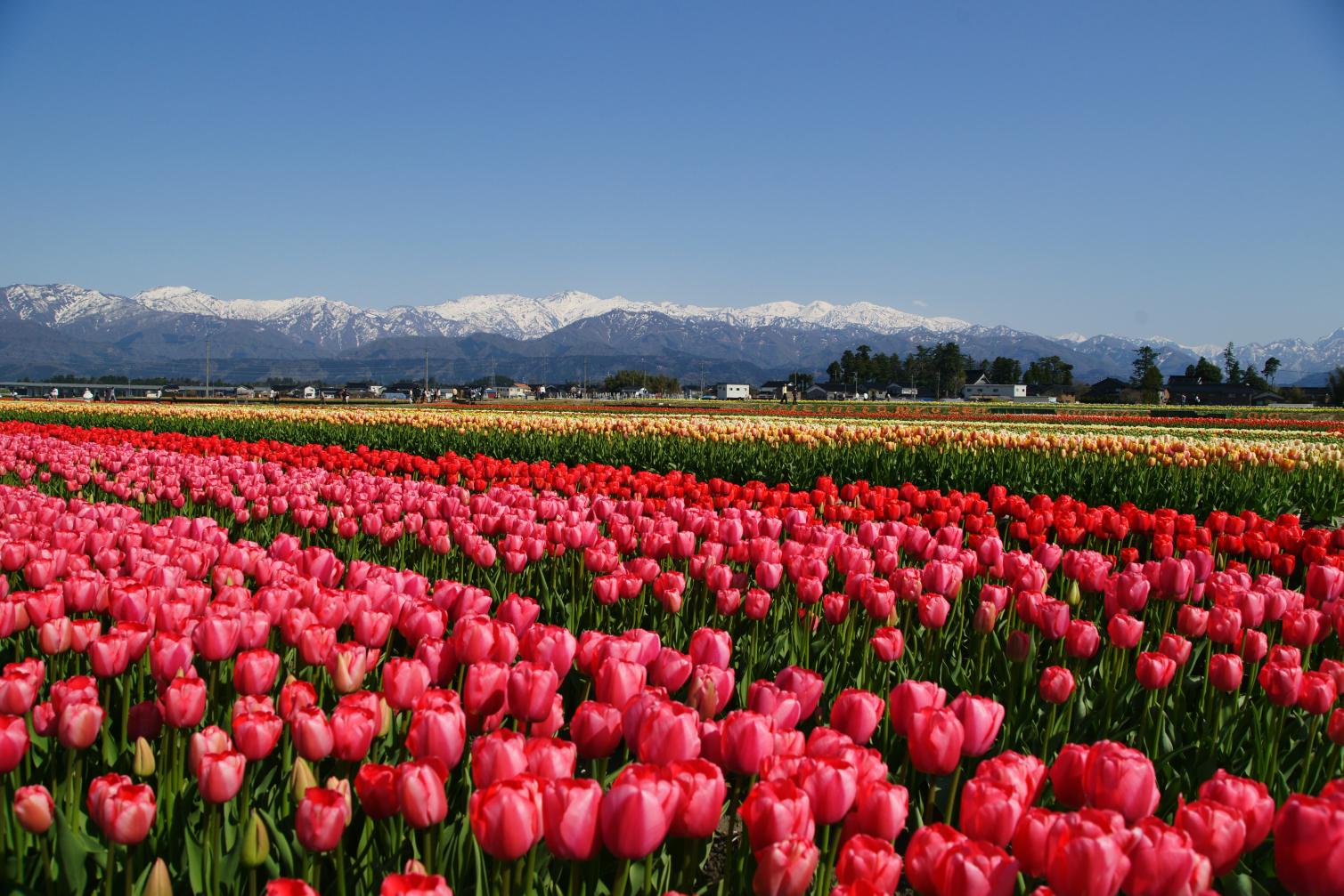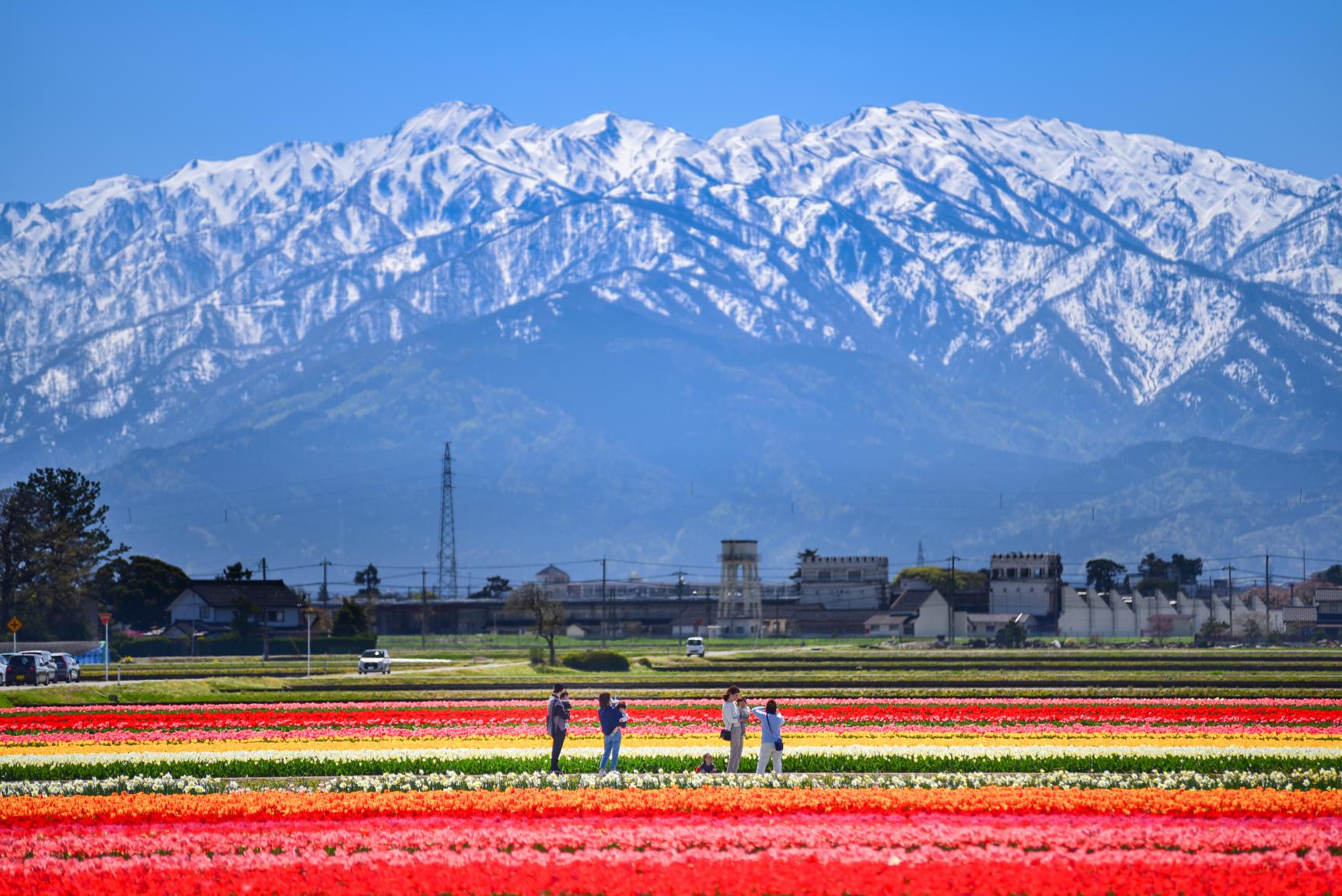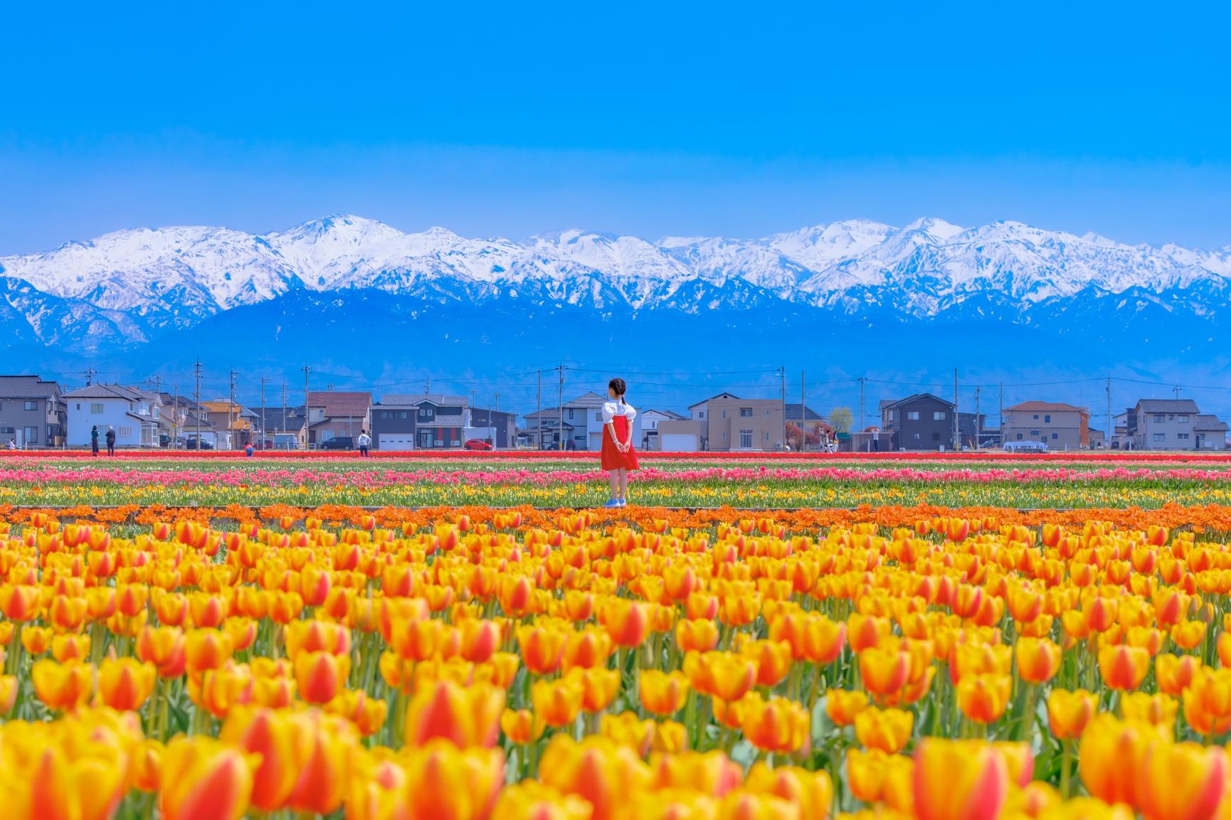 にゅうぜんフラワーロードは、富山県入善町で毎年春に開催される、チューリップを中心とした花のイベントです。国内最大級を誇る広大な畑には、200万本のチューリップや菜の花が咲き並びます。残雪の北アルプスを背景にした景色は圧巻です。