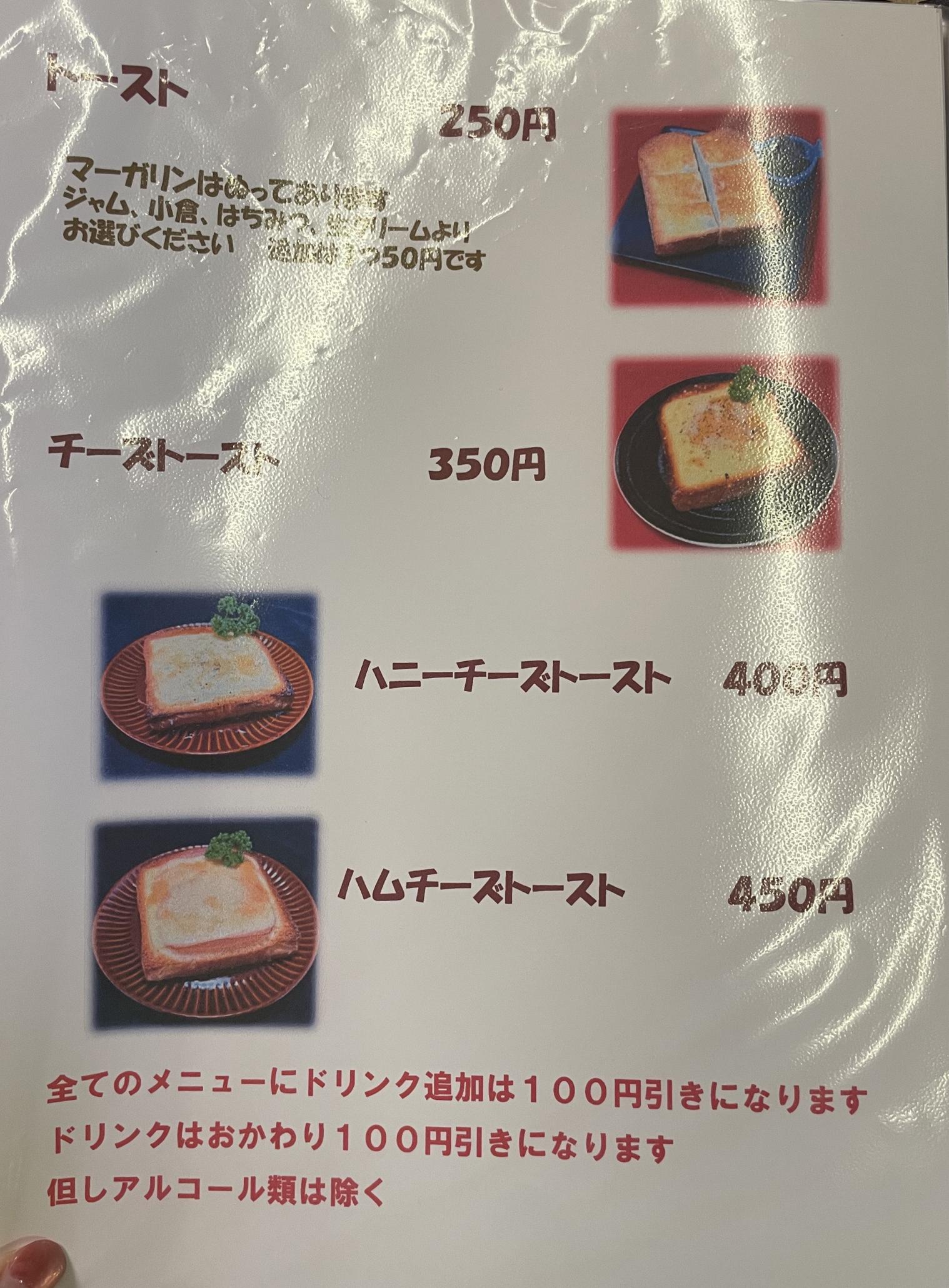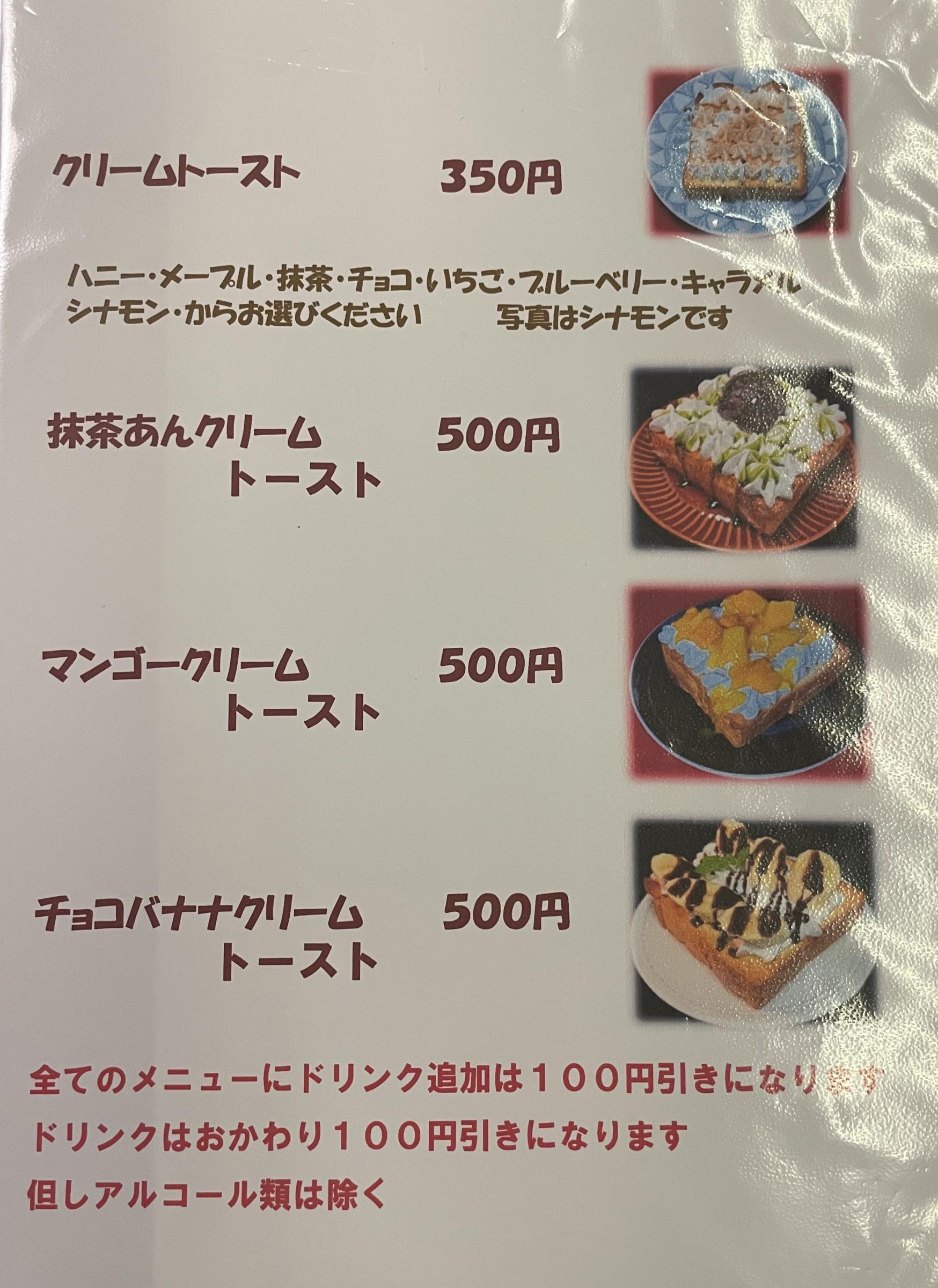 • トースト(ジャム、はちみつ、小倉、生クリームから2つチョイス)