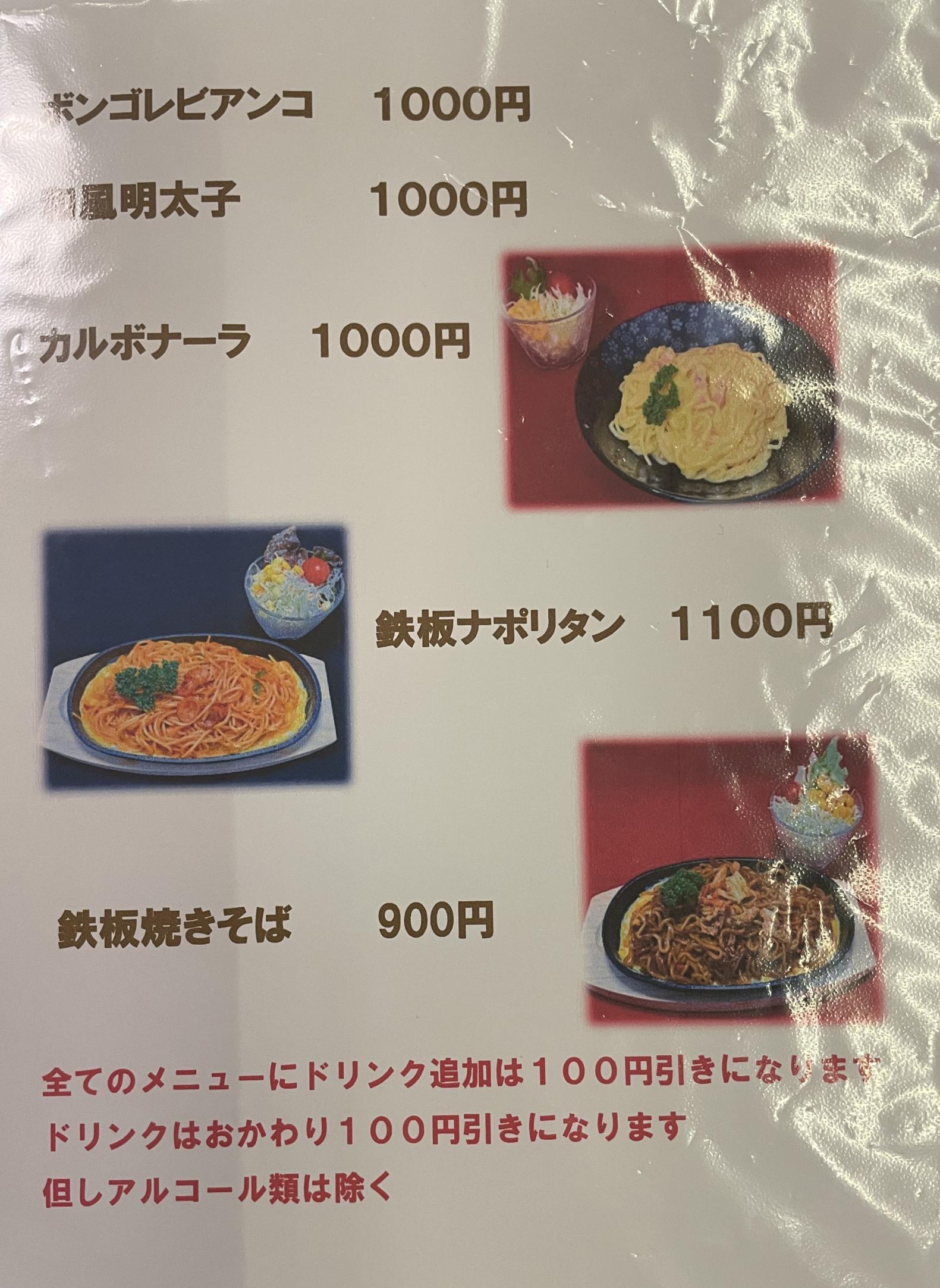 熱々の鉄板に溶き卵が敷かれ、その上にナポリタンが盛り付けられている「鉄板ナポリタン」。鉄板で提供されるため、最後まで温かい状態で楽しめます。ナポリタンと半熟の卵が絡み合ってまろやかな味わい。卓上にあるタバスコで味変も楽しめます。