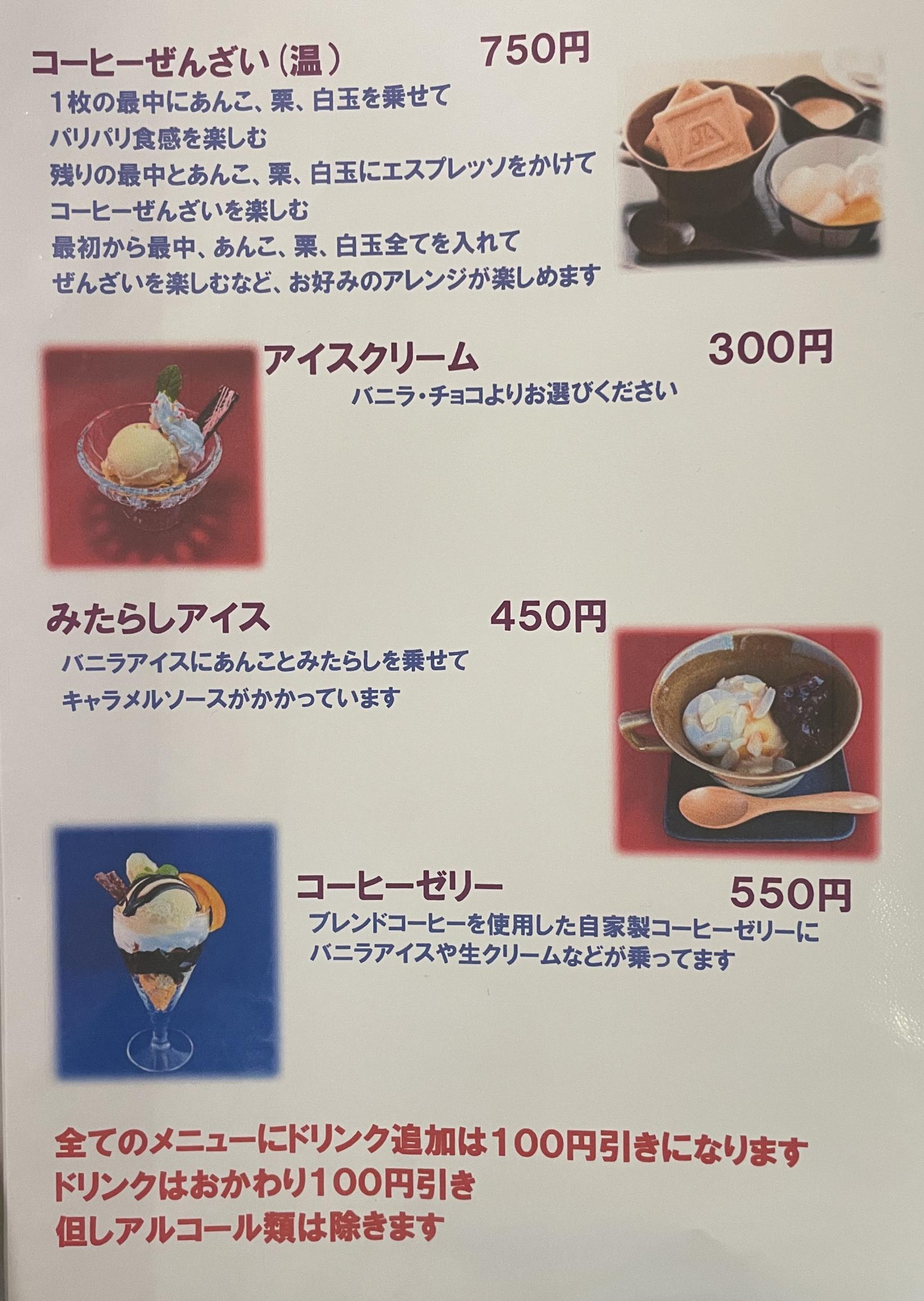 他にも厚切りのトーストにあんこと抹茶ソース、生クリームをたっぷりのせた「抹茶あんクリームトースト」や、バニラアイスにあんことみたらしをのせた「みたらしアイス」、自家製「コーヒーゼリー」など魅力的な喫茶甘味もありました。