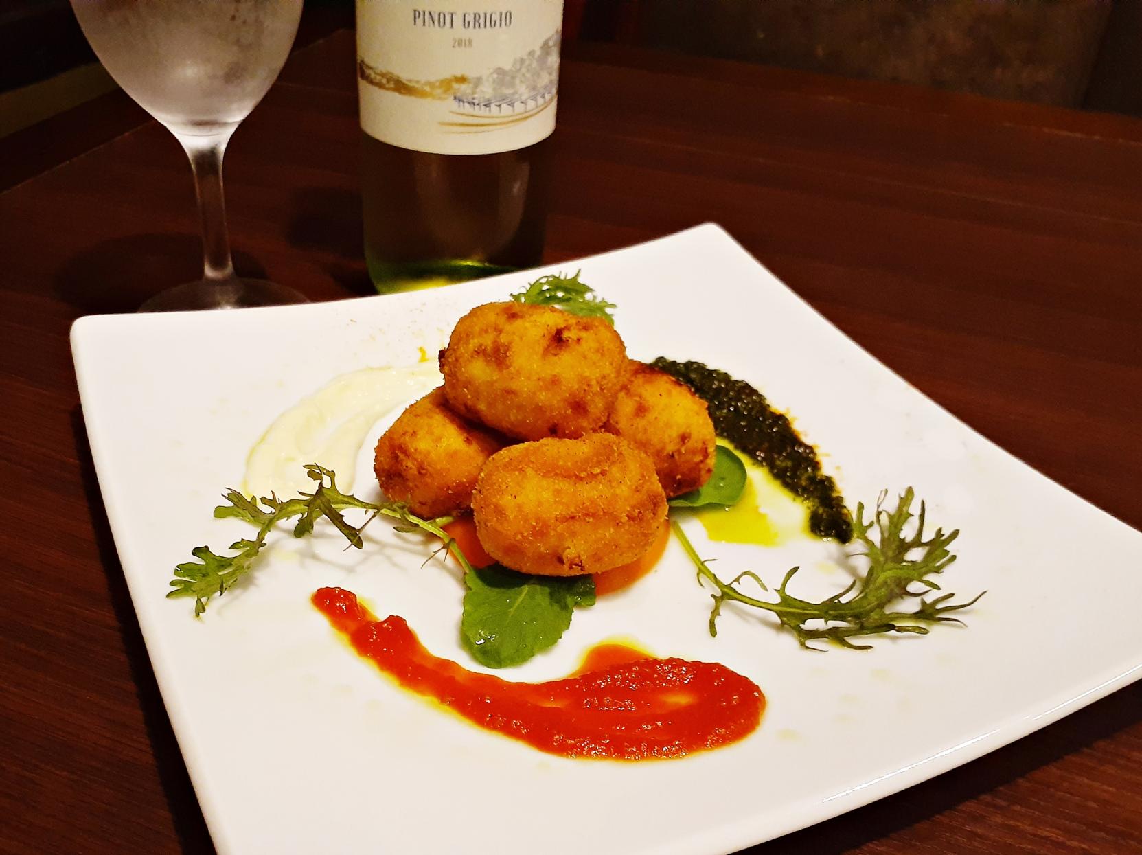 アランチーニとはイタリアのライスコロッケのこと。香ばしく揚げられた白エビのライスコロッケにバジル、チーズ、トマトの3色のソースを添えていただきます!