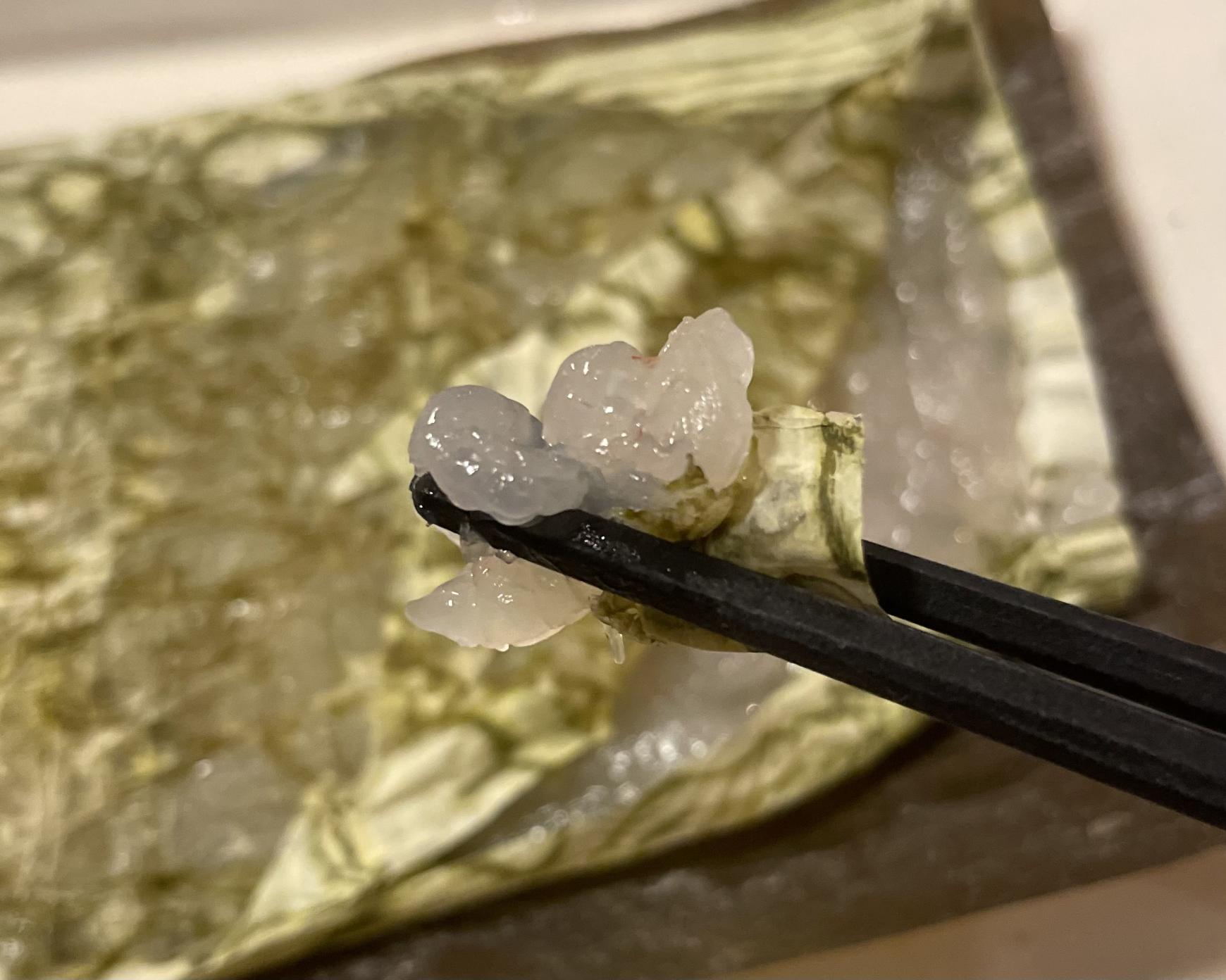 通常のお刺身でも甘味を感じるシロエビですが、昆布の旨味成分が白エビと相まってさらに旨味がアップ。醤油無しでもいただけ、おぼろ昆布と絡めると味の変化も楽しめます。手土産や贈り物などにも喜ばれますよ。