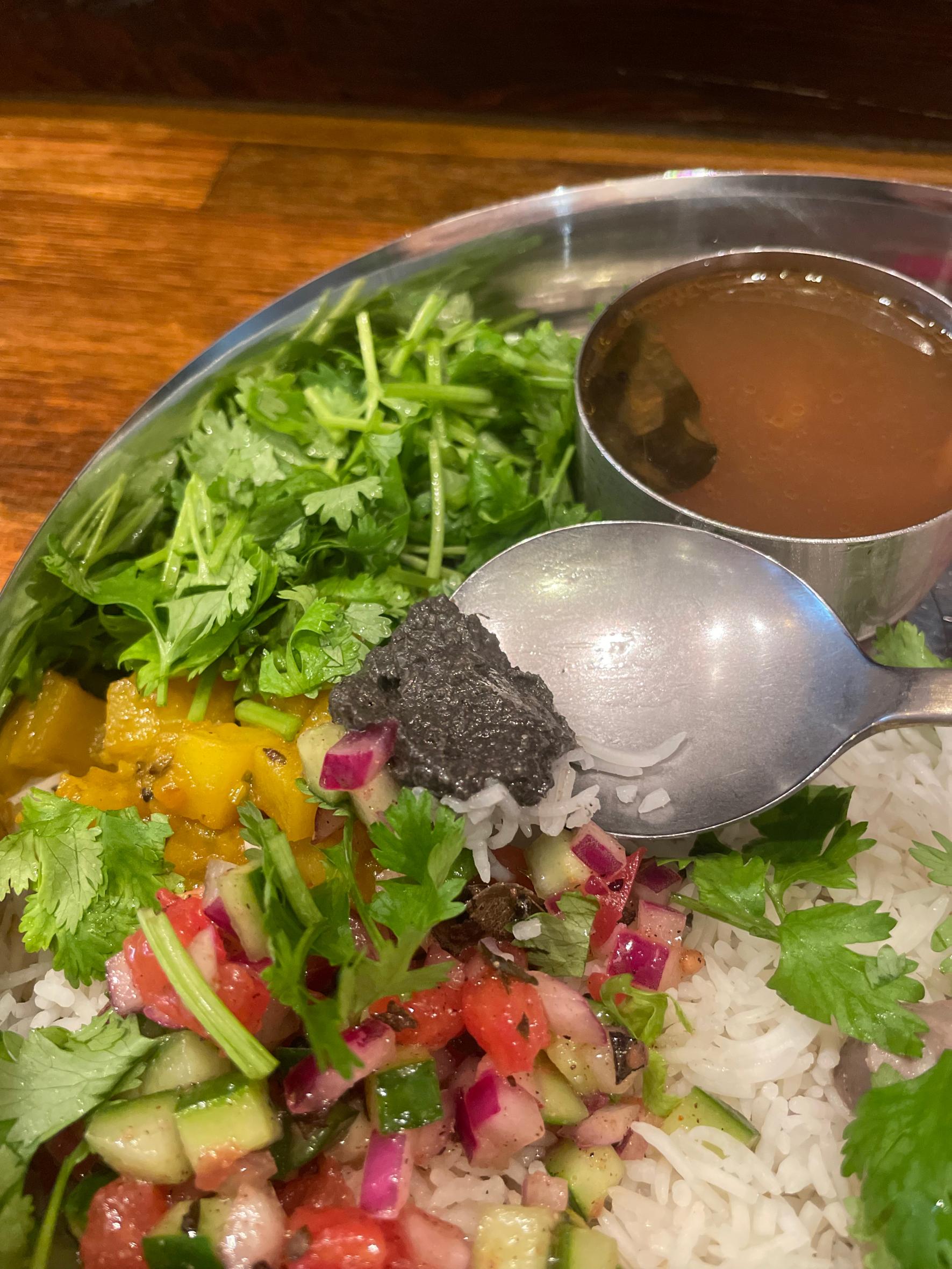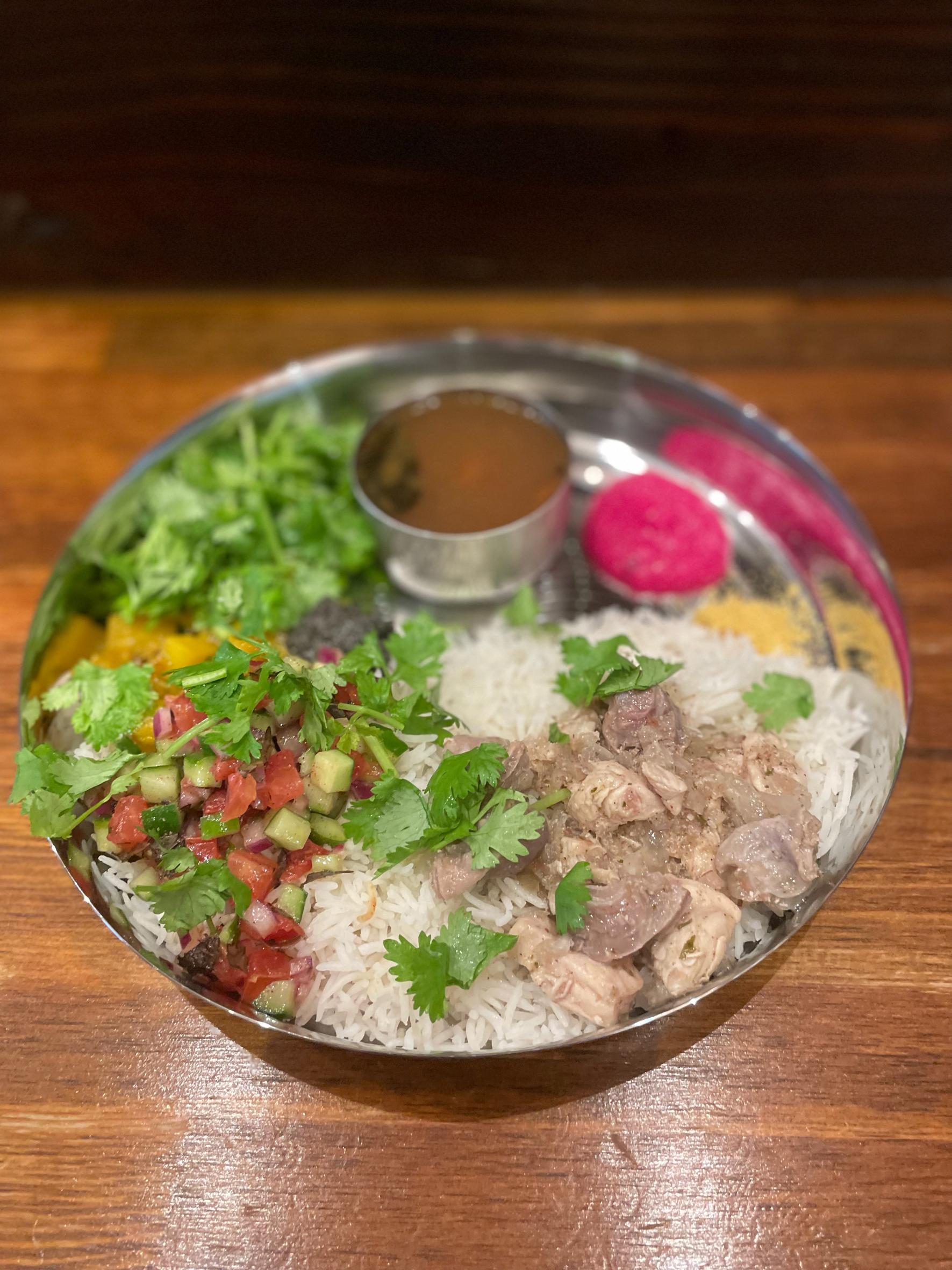 キュウリや紫玉ねぎなど夏野菜のさっぱり感とバスマティライスのパラリとした食感。お肉は大好きな砂肝にささみ。そして冷えひえスープのほどよい辛味が最高でした。