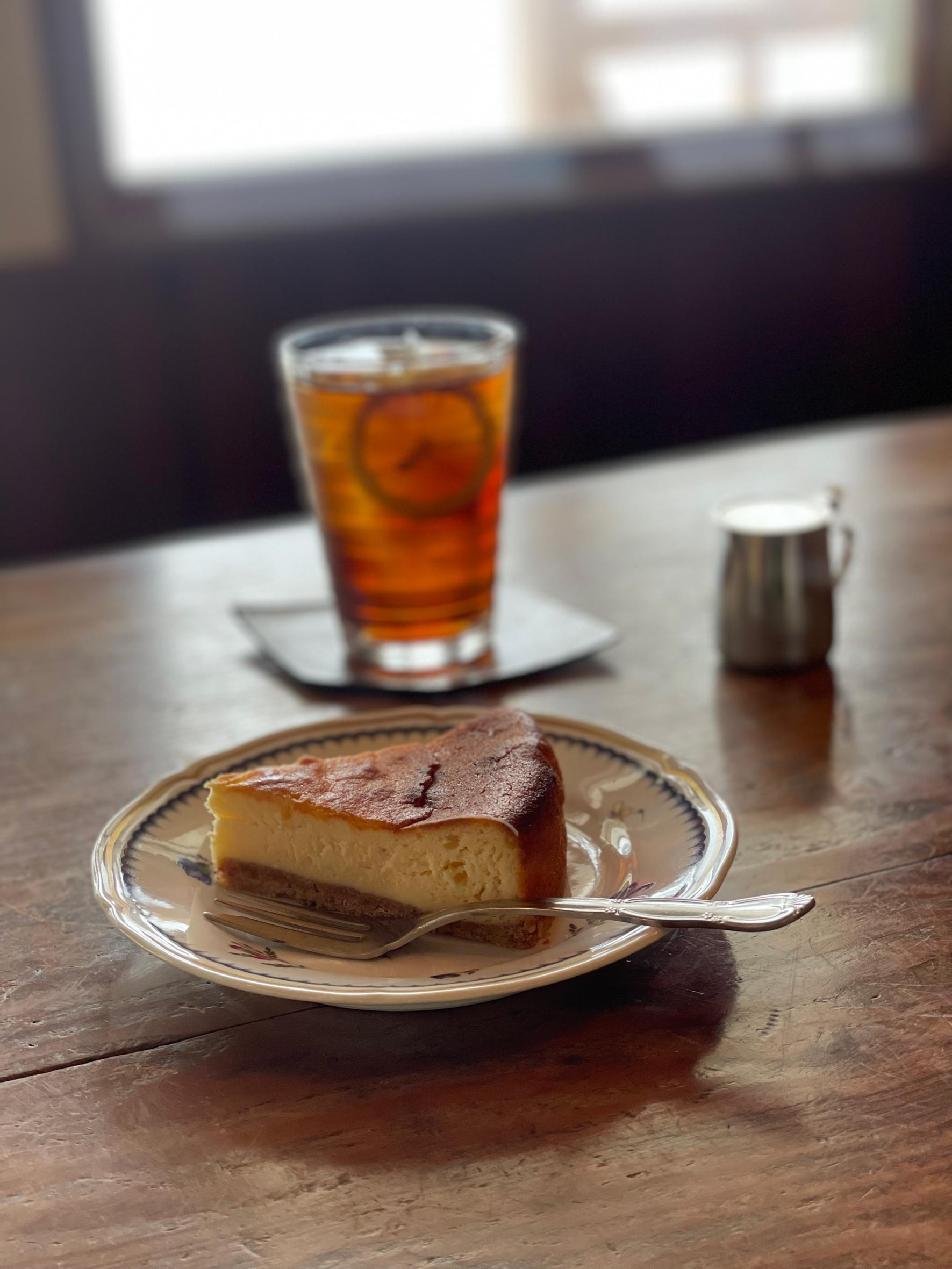 香り高いアールグレイとともに味わいたい「ケーキセット」(770円)。甘酸っぱくてクリーミーな北海道産クリームチーズを使った「チーズケーキ」は土台のクルミがアクセントになっていました。