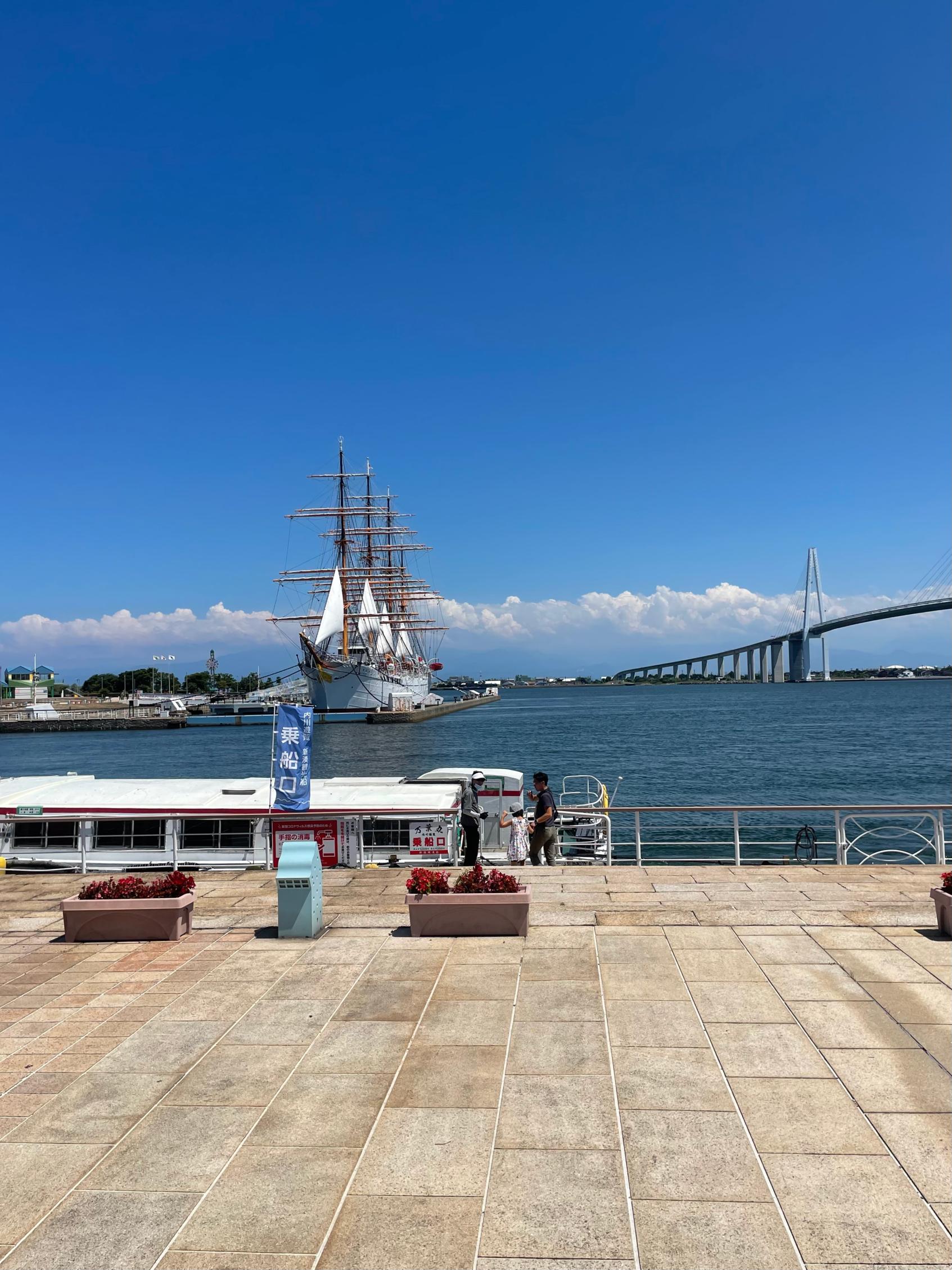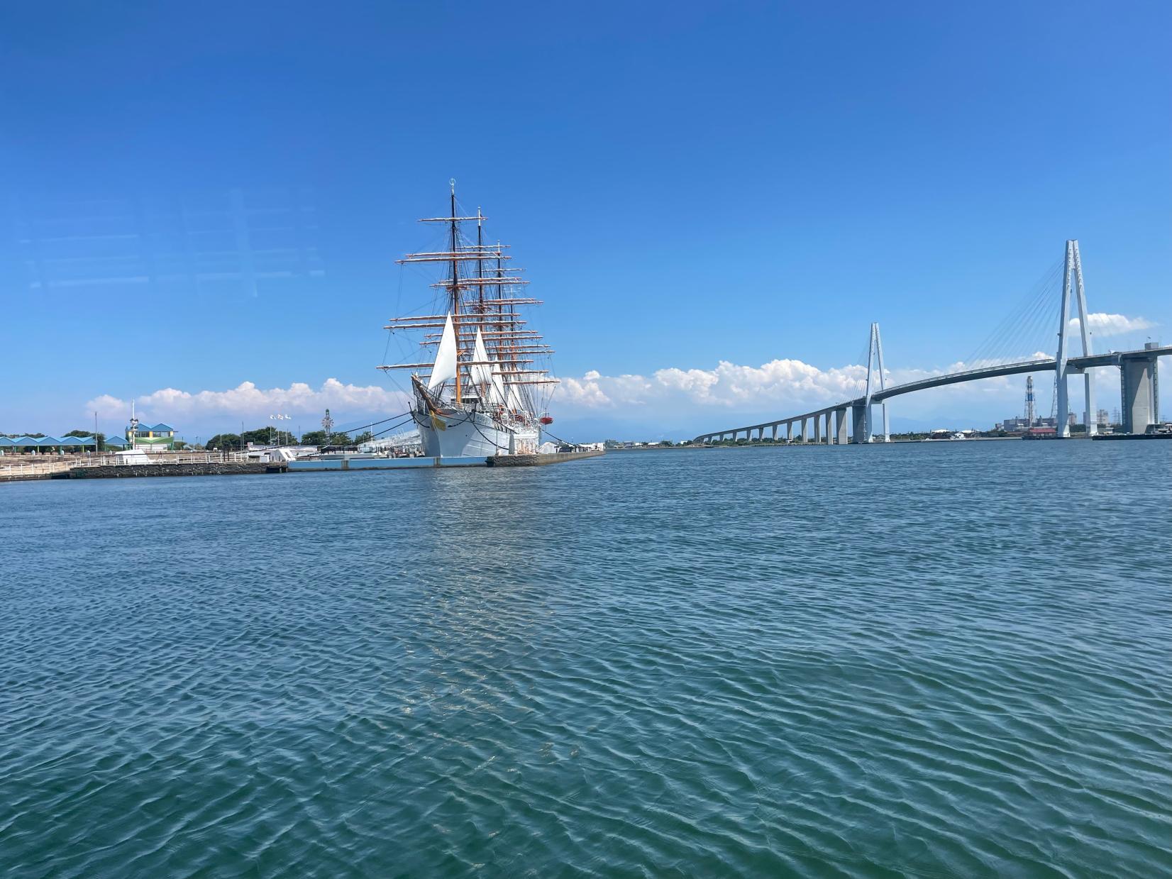 天気の良い日は、海上から見る海王丸と新湊大橋と立山連峰の極上の景色が楽しめます。