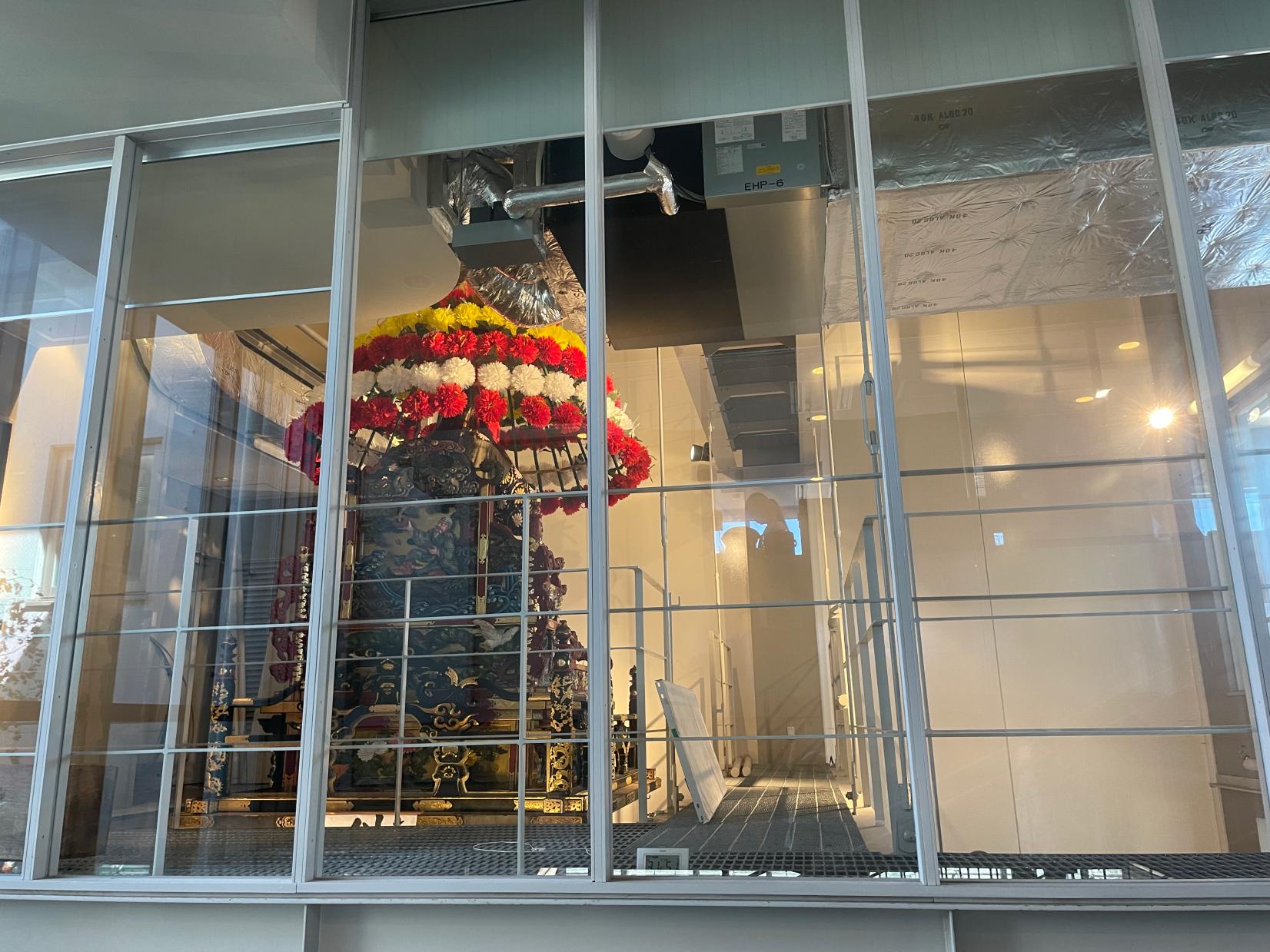 「川の駅 新湊」には、射水の特産品を販売する売店や、毎年10月1日に新湊市街を曳き回す豪華絢爛な曳山を常時展示する「曳山展示室」、カフェレストランがあります。