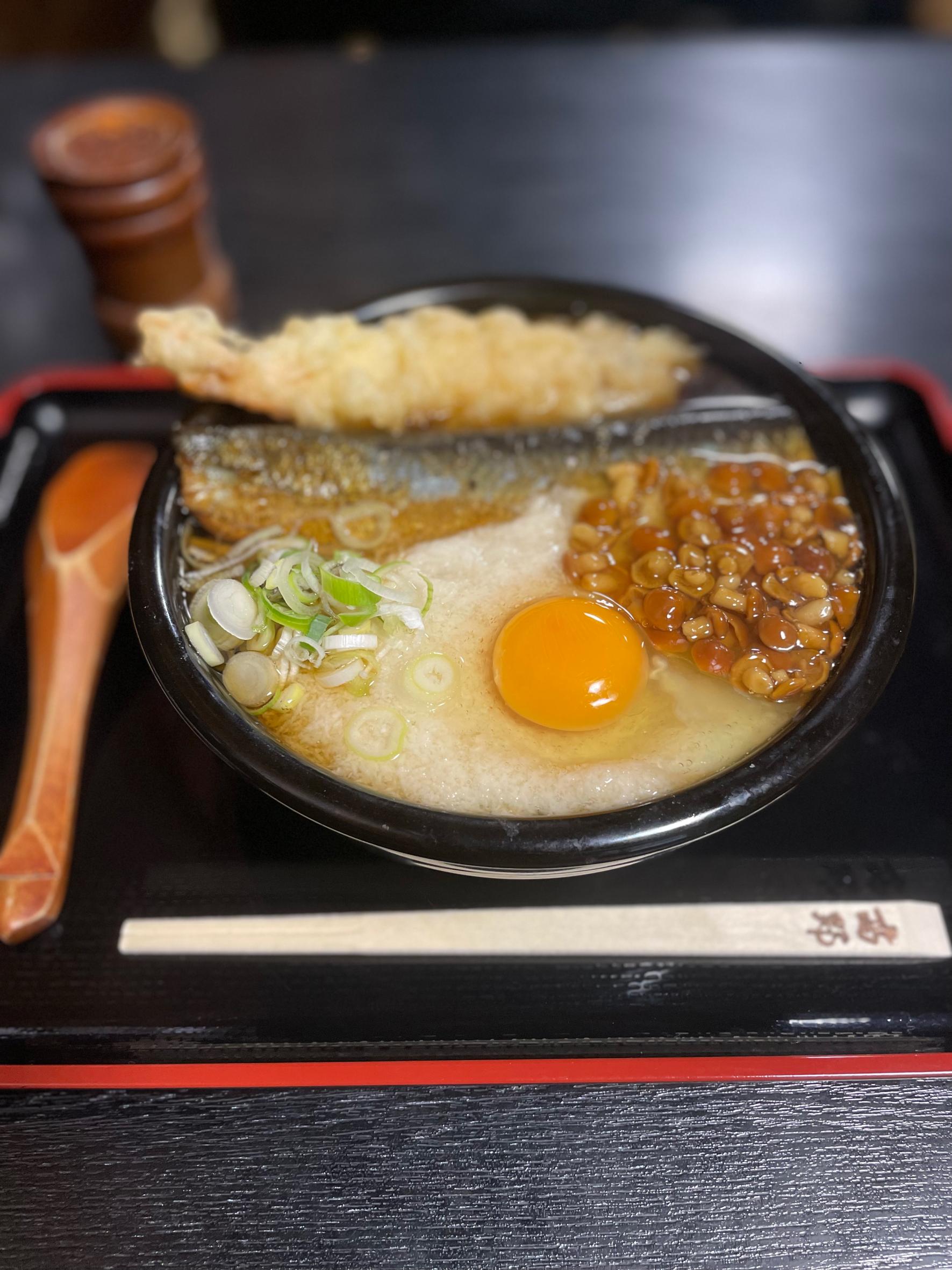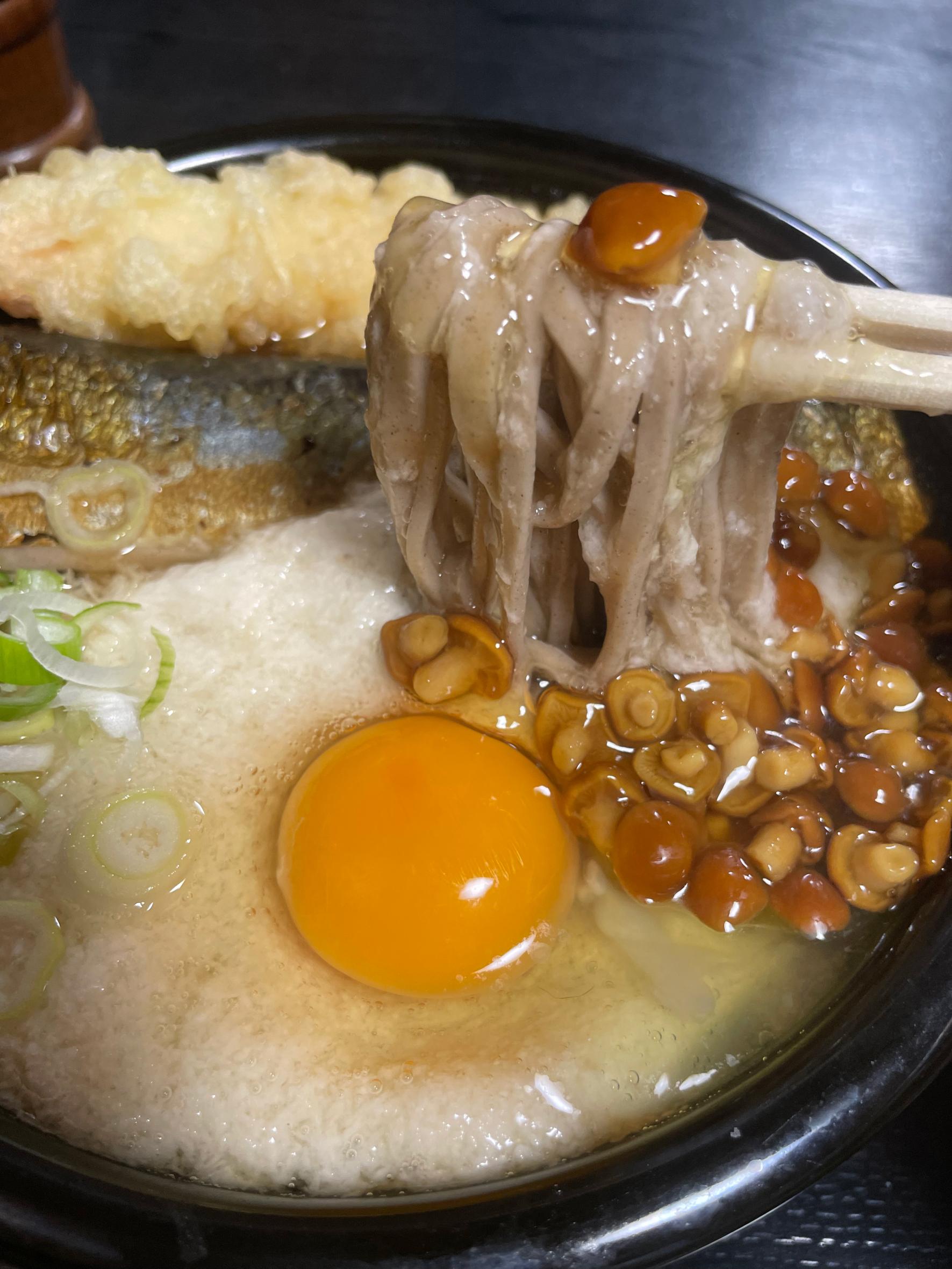 「千両そば」は甘辛く煮たニシンに海老の天ぷら、ナメコ、玉子、トロロと具材のフルコース。お出汁は最後の一口まで飲み干す美味しさ。麺も具も食べ応えがあり、大満足できる一杯です。