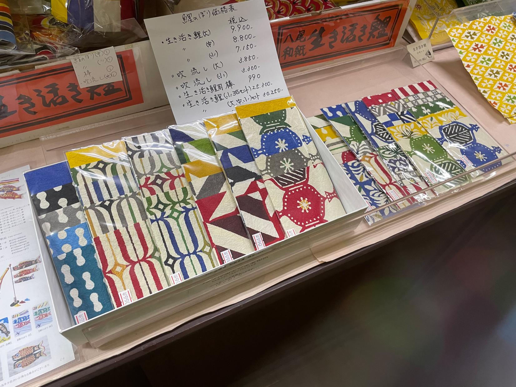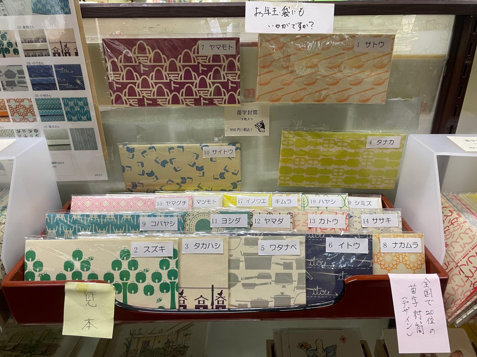 そのほか、デザイン性の高い「鯉のぼり」や。日本に多い苗字をパターン化した封筒など、お祝いやお土産にピッタリなアイテムが並んでいます。