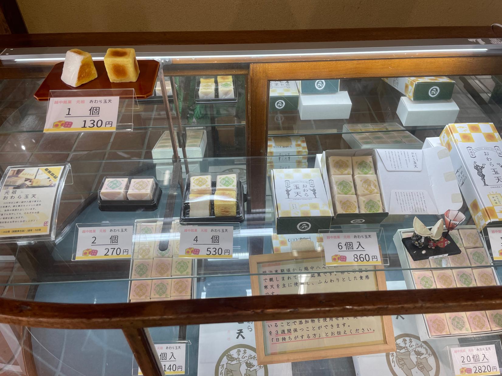 八尾地区に伝わる和菓子「玉天」。林盛堂本店では「おわら玉天」として販売しています。