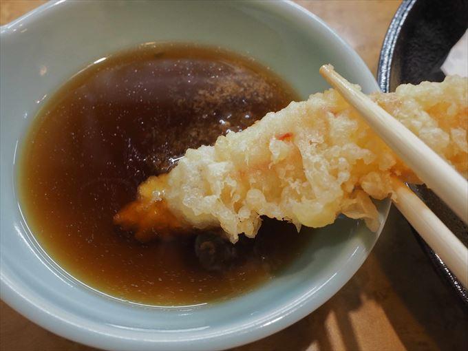 衣はサックサクで、旨味を閉じ込めたジューシーなネタが濃いめの天つゆとばっちりマッチしています。