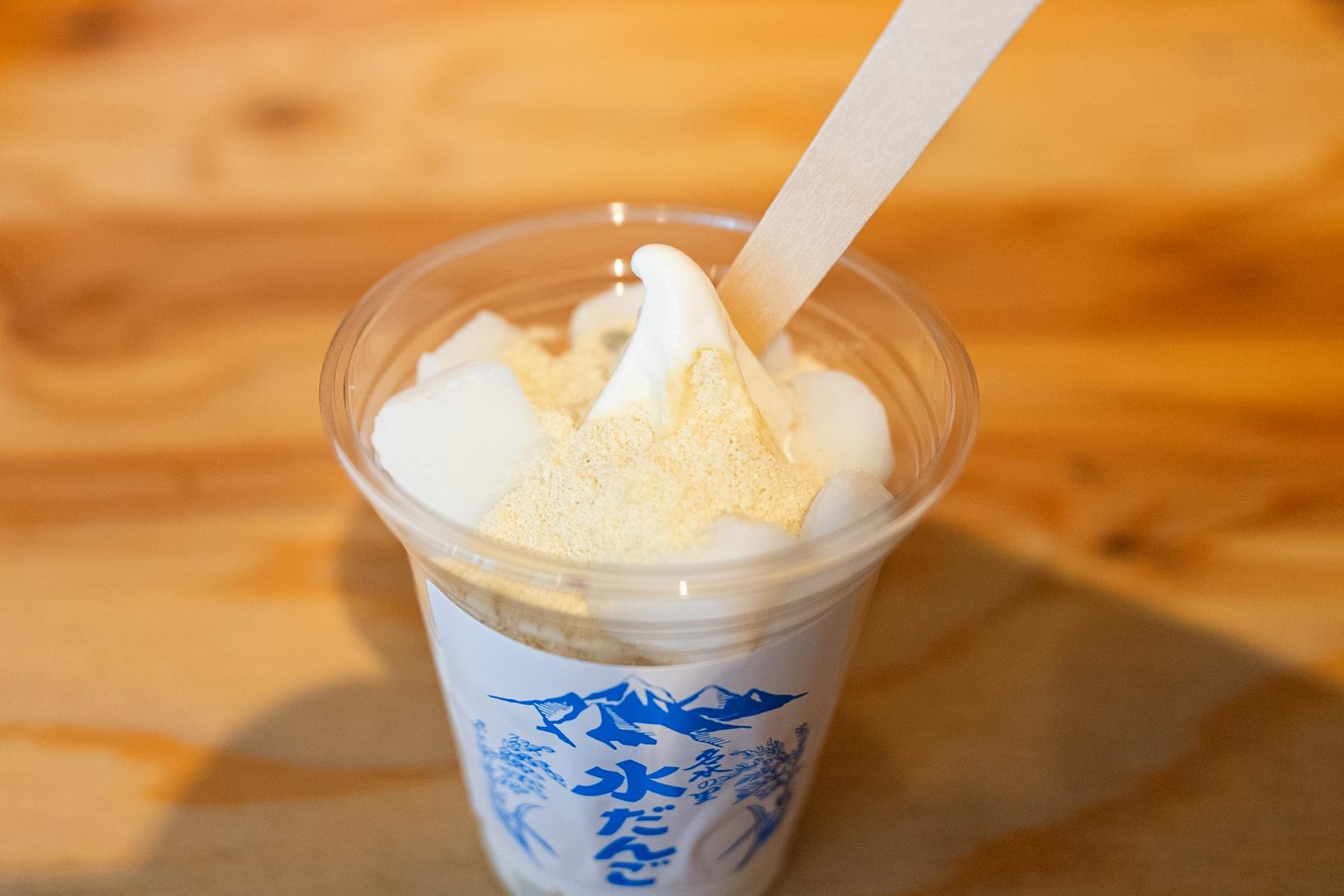 水だんごには甘じょっぱい味に仕上げた青大豆きな粉がかかっており、甘いソフトクリームにマッチして美味しいの一言!!