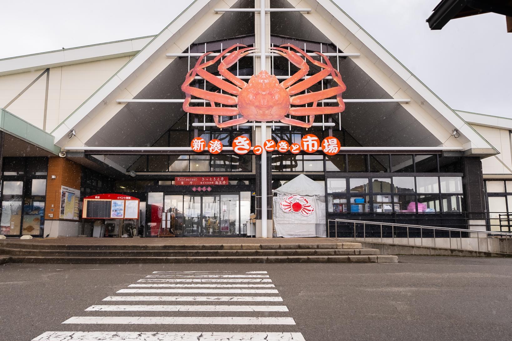 大きな蟹のオブジェが出迎えてくれる「新湊きっときと市場」では、新湊漁港で獲れた海の幸を堪能できます。