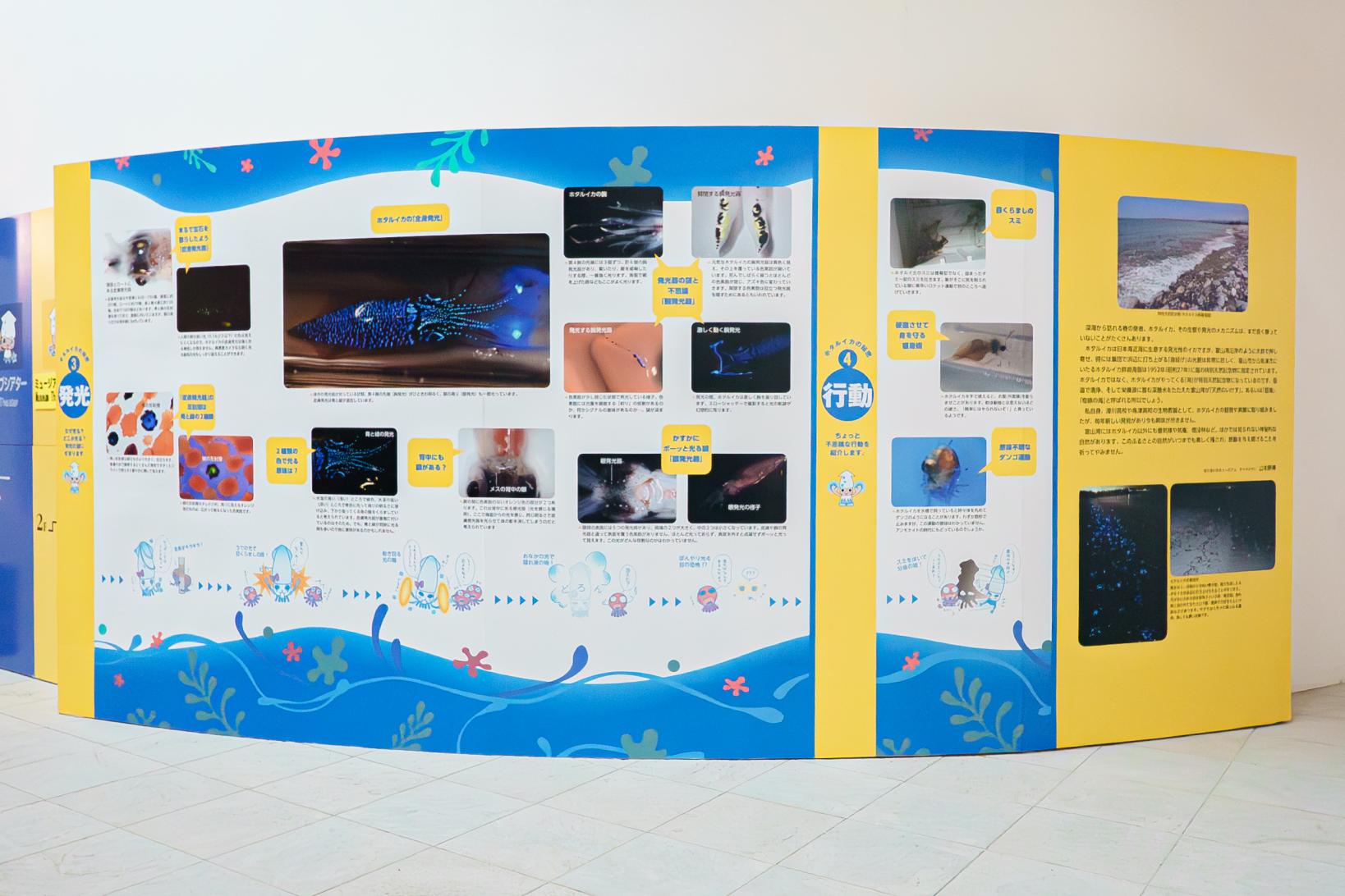 発光ショーでは、ホタルイカ漁や、ミュージアムまでホタルイカを運び入れる様子などを、映像とスタッフさんの説明で学んだ後、実際にホタルイカの発光する姿を見ることができます!