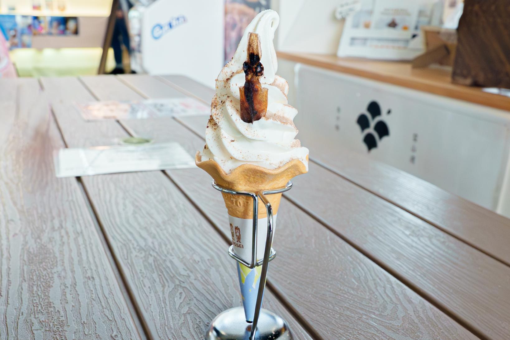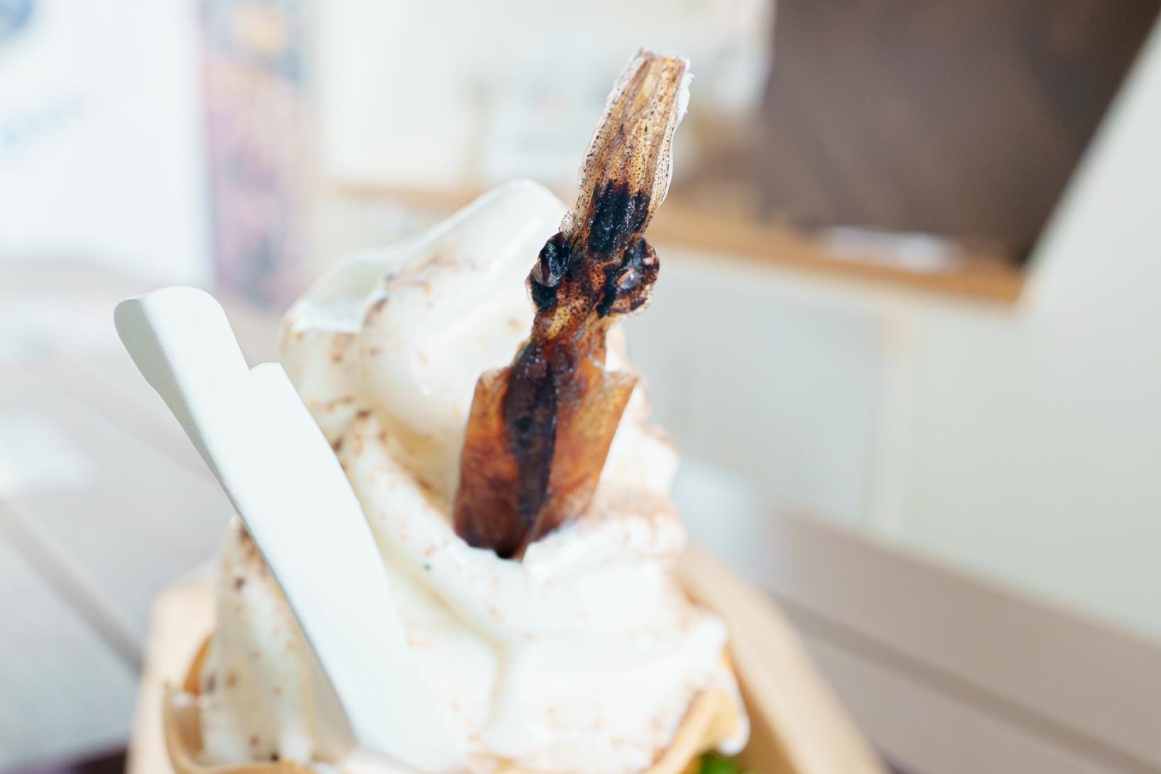 ほたるいかふりかけソフトは、ほんのりとほたるいかの香りを感じながら、素干しも食べられる名物ソフトです!